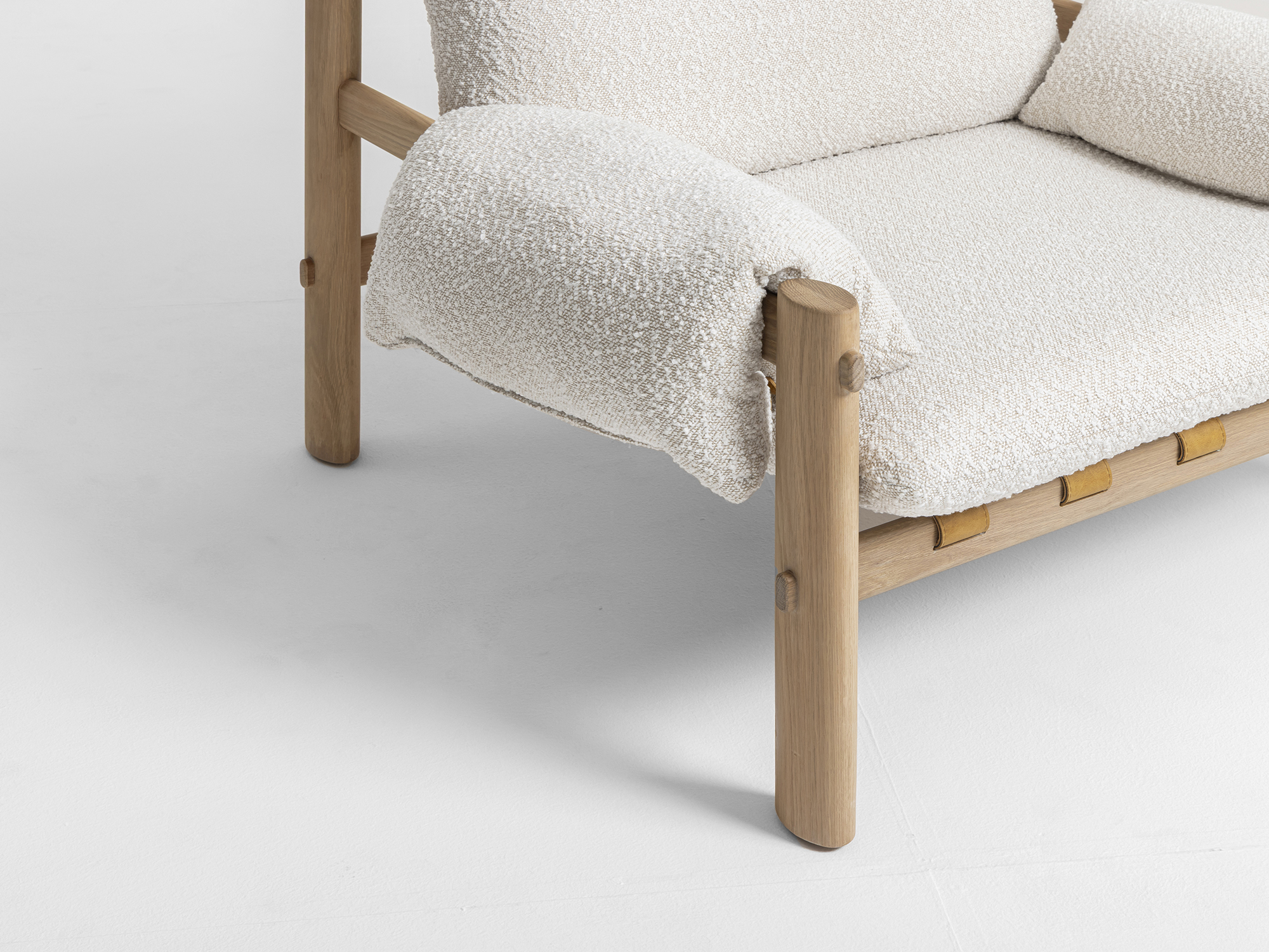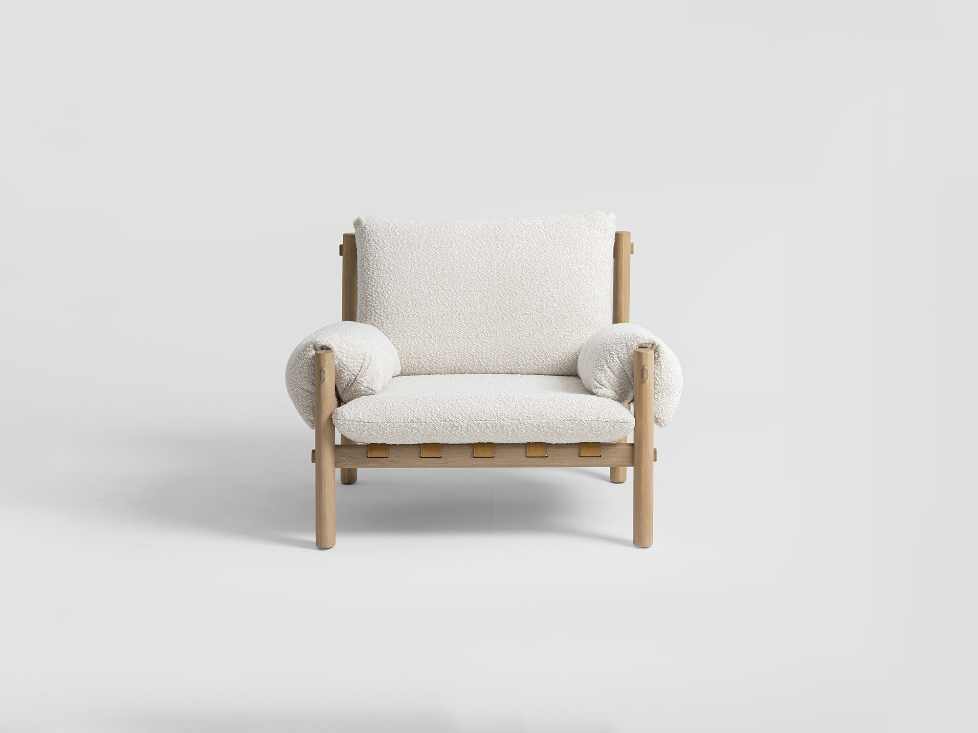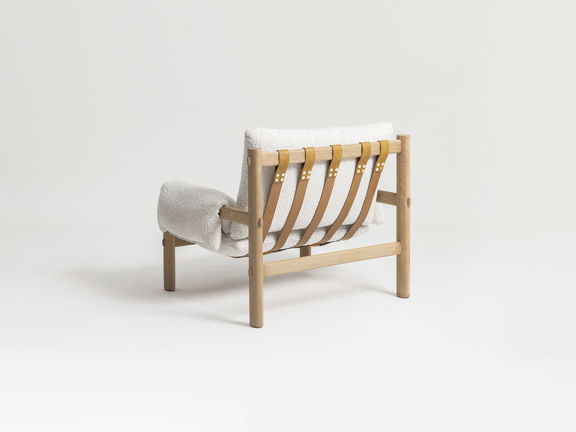 The Abbe lounge chair have loose cousins in bouclé fabric and genuine tan leather straps for webbing.