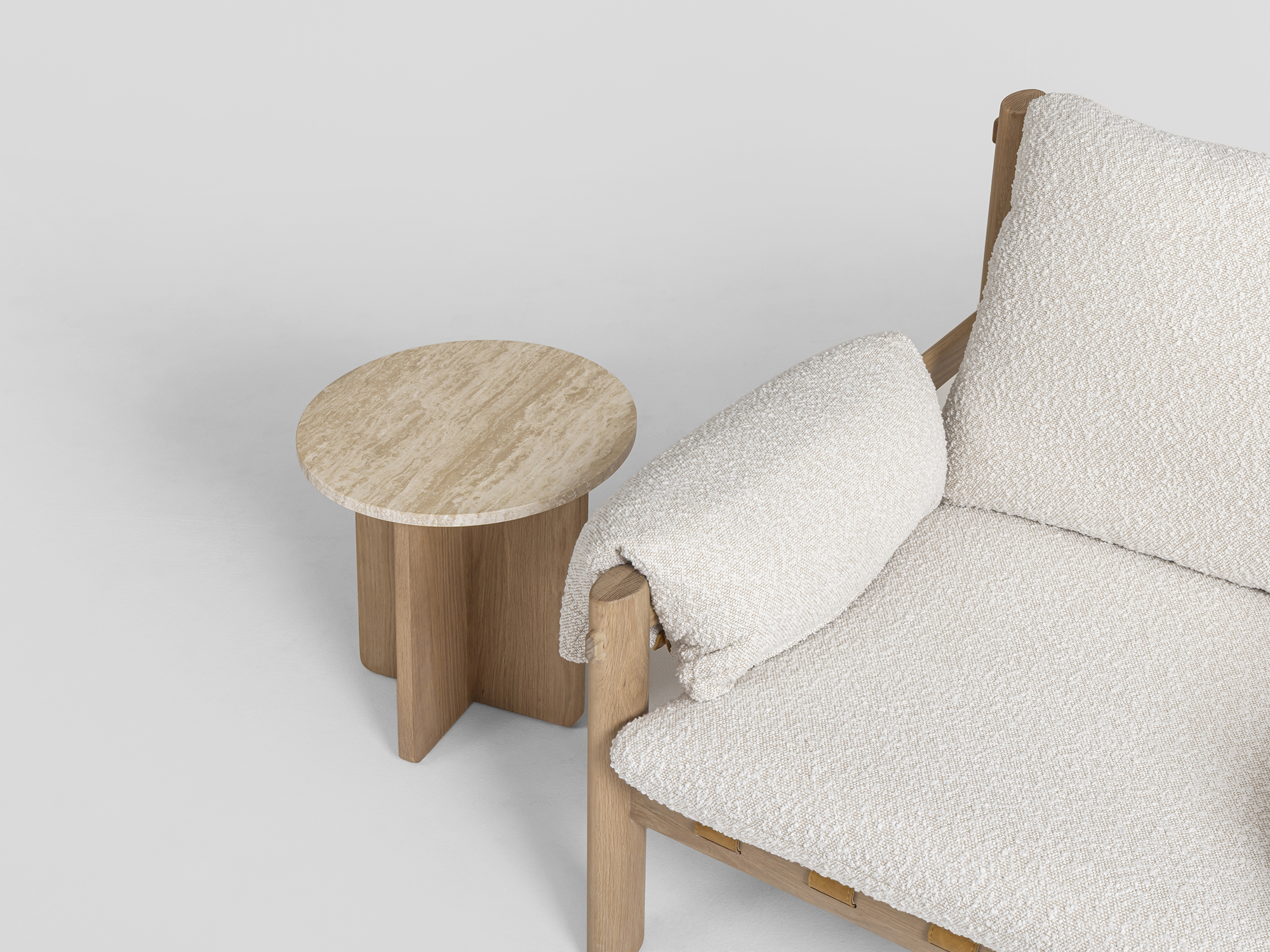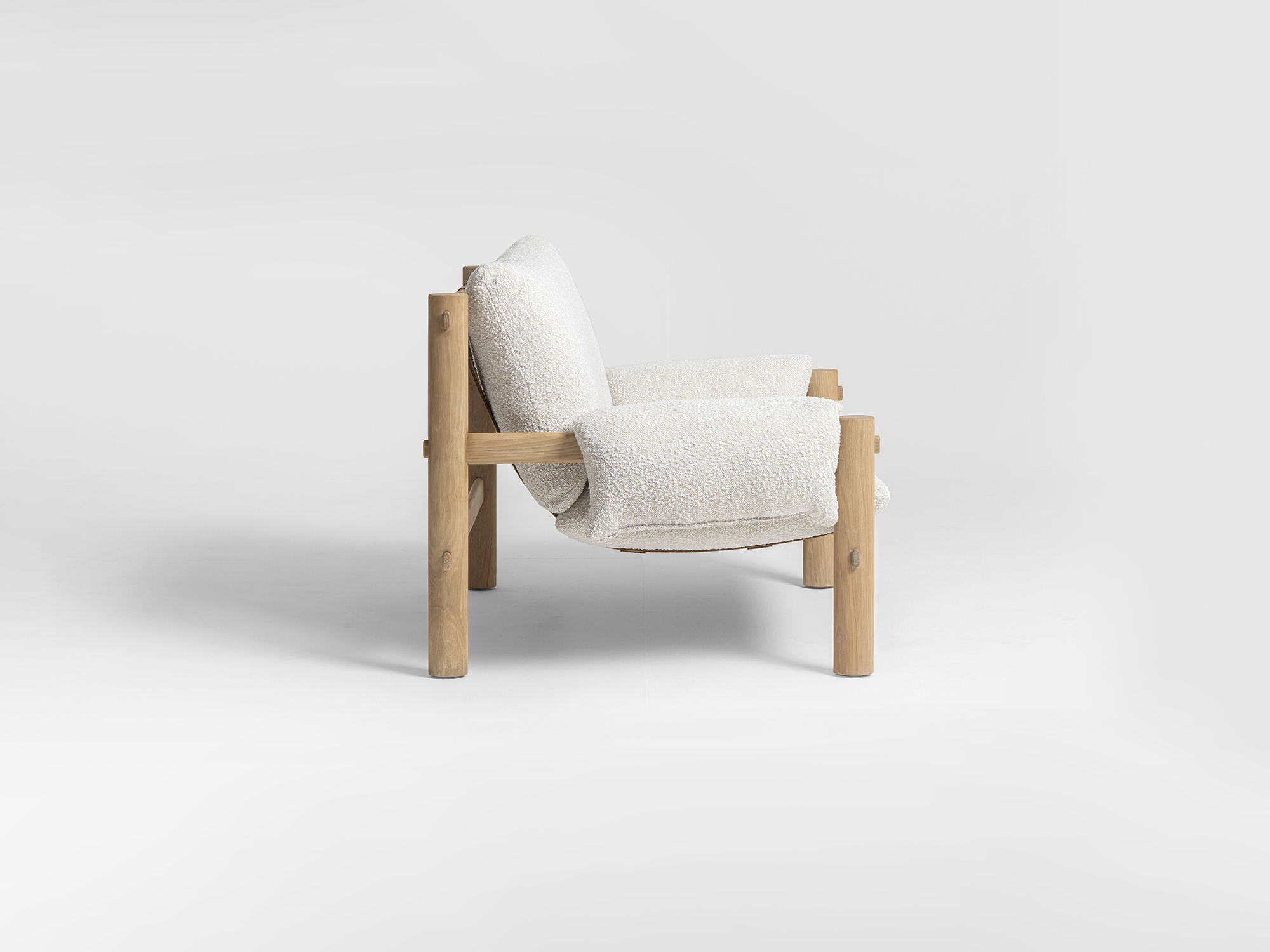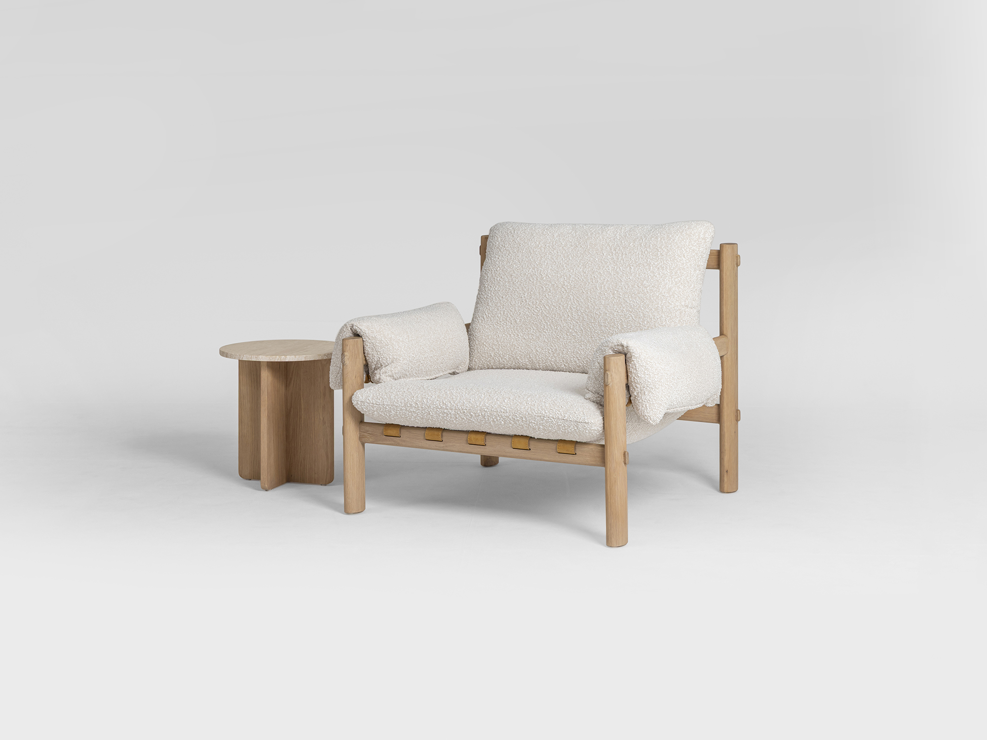 The Abbe lounge chair have loose cousins in bouclé fabric and genuine tan leather straps for webbing.