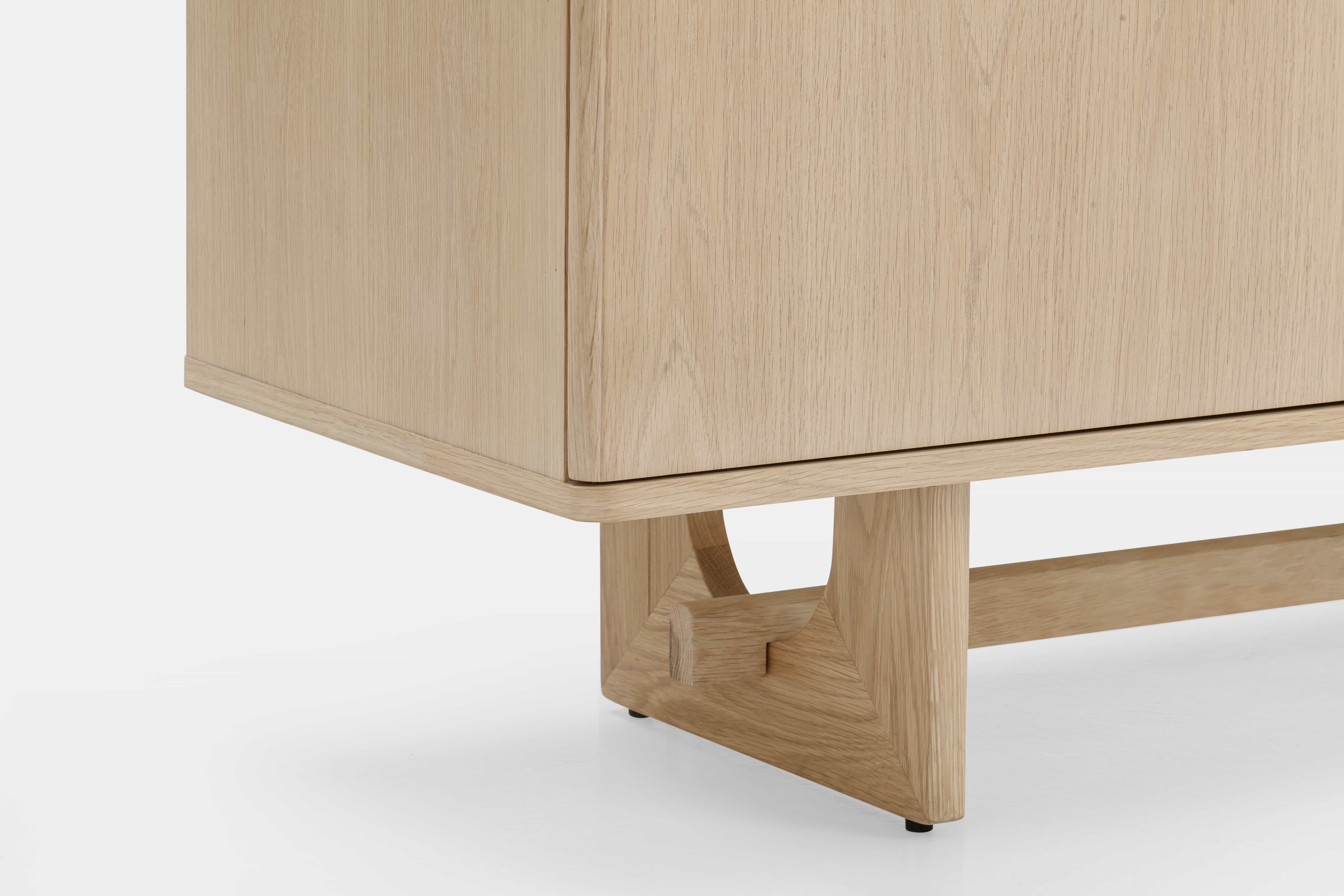The Arch media unit beautifully pairs natural materials and sculptural forms. The table is created with solid timber veneer top and solid wood base and brass handle hardware. Finished in natural Tung oil. Design by: Anders Östberg