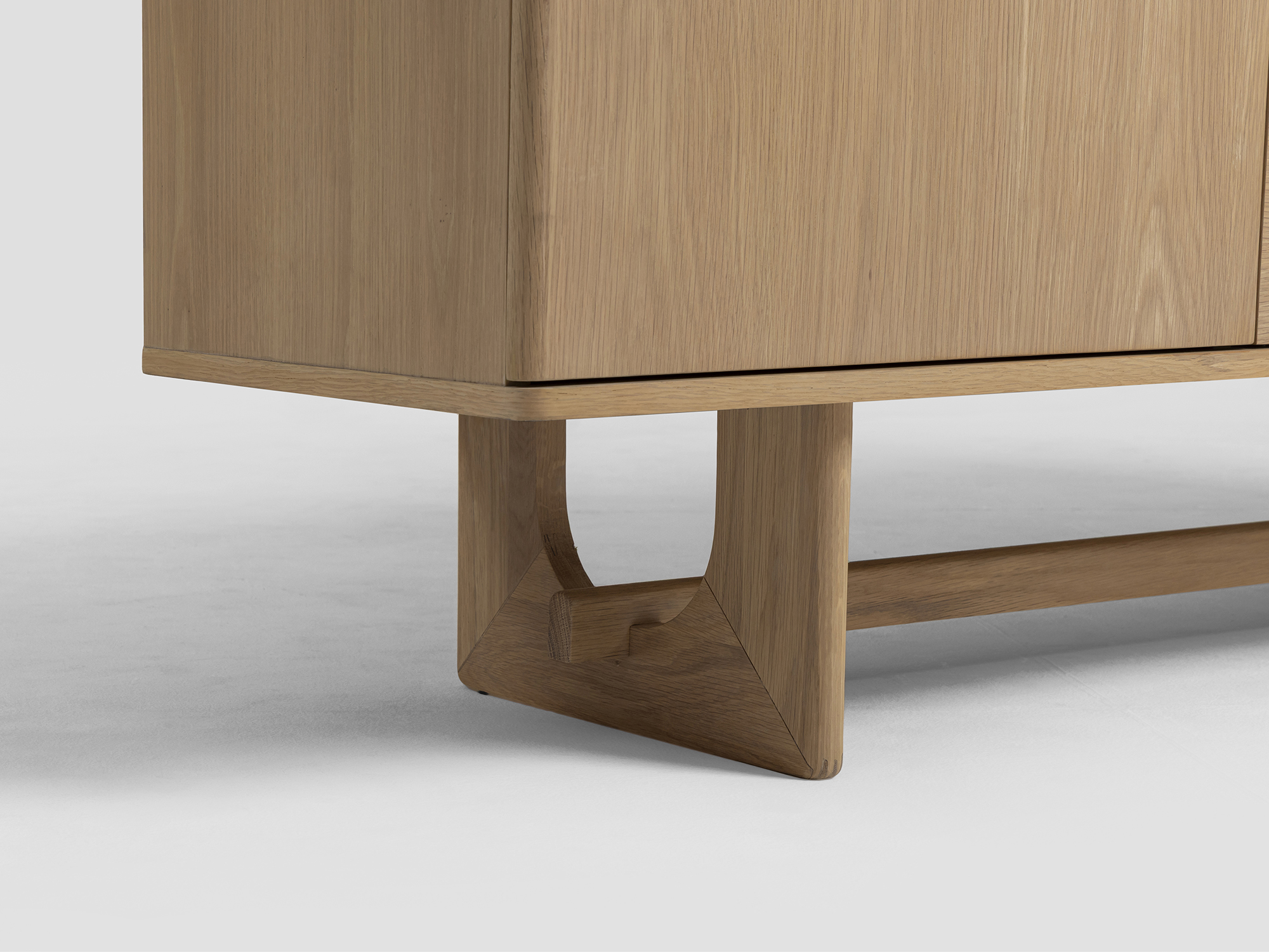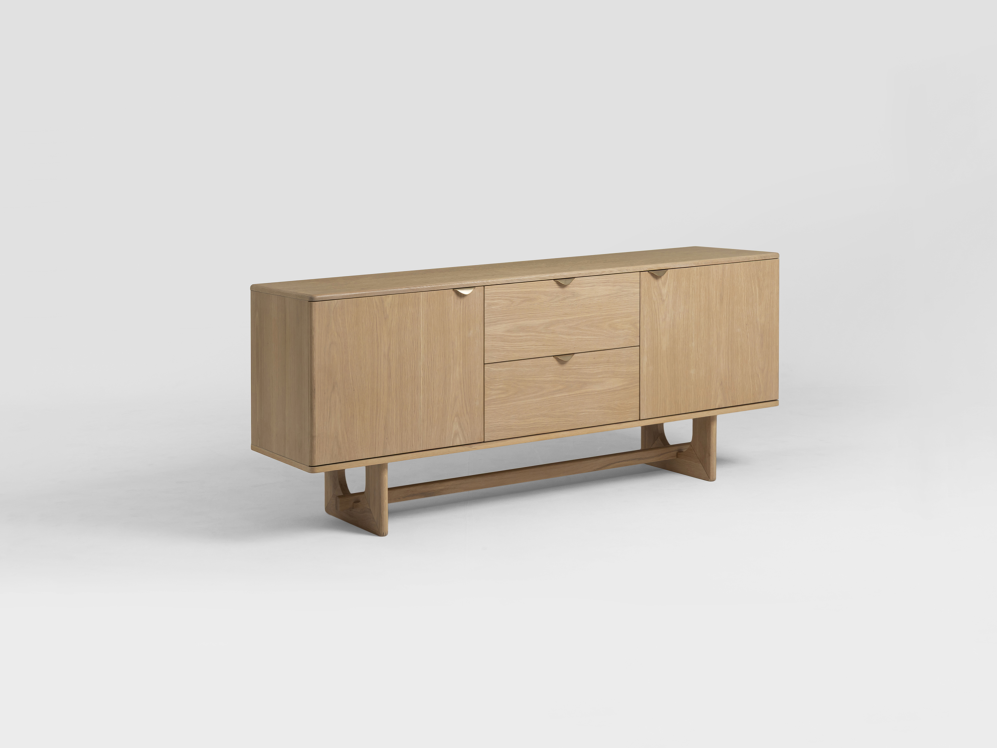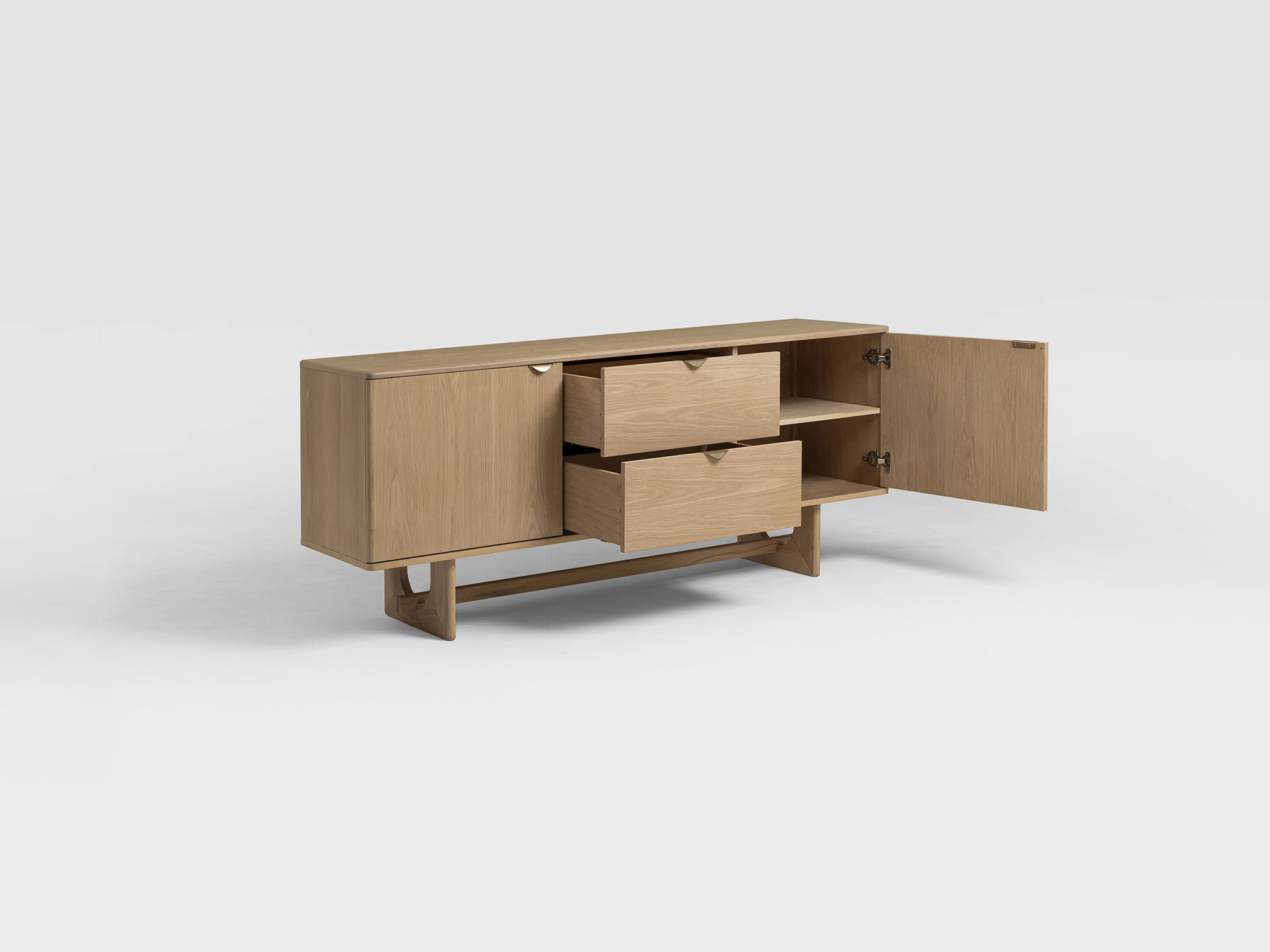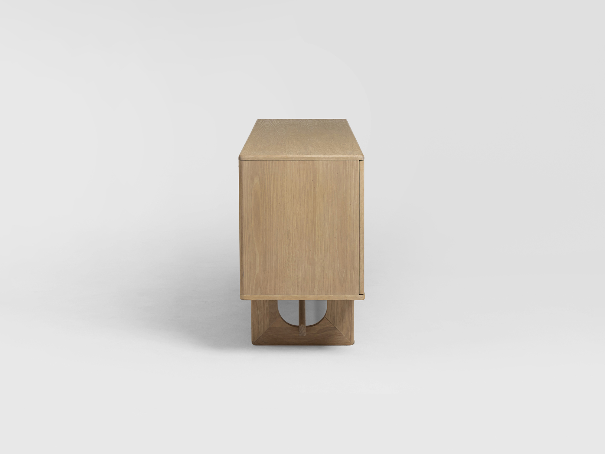The Arch sideboard beautifully pairs natural materials and sculptural forms. The table is created with solid timber veneer top and solid wood base and brass handle hardware. Finished in natural Tung oil. Design by: Anders Östberg