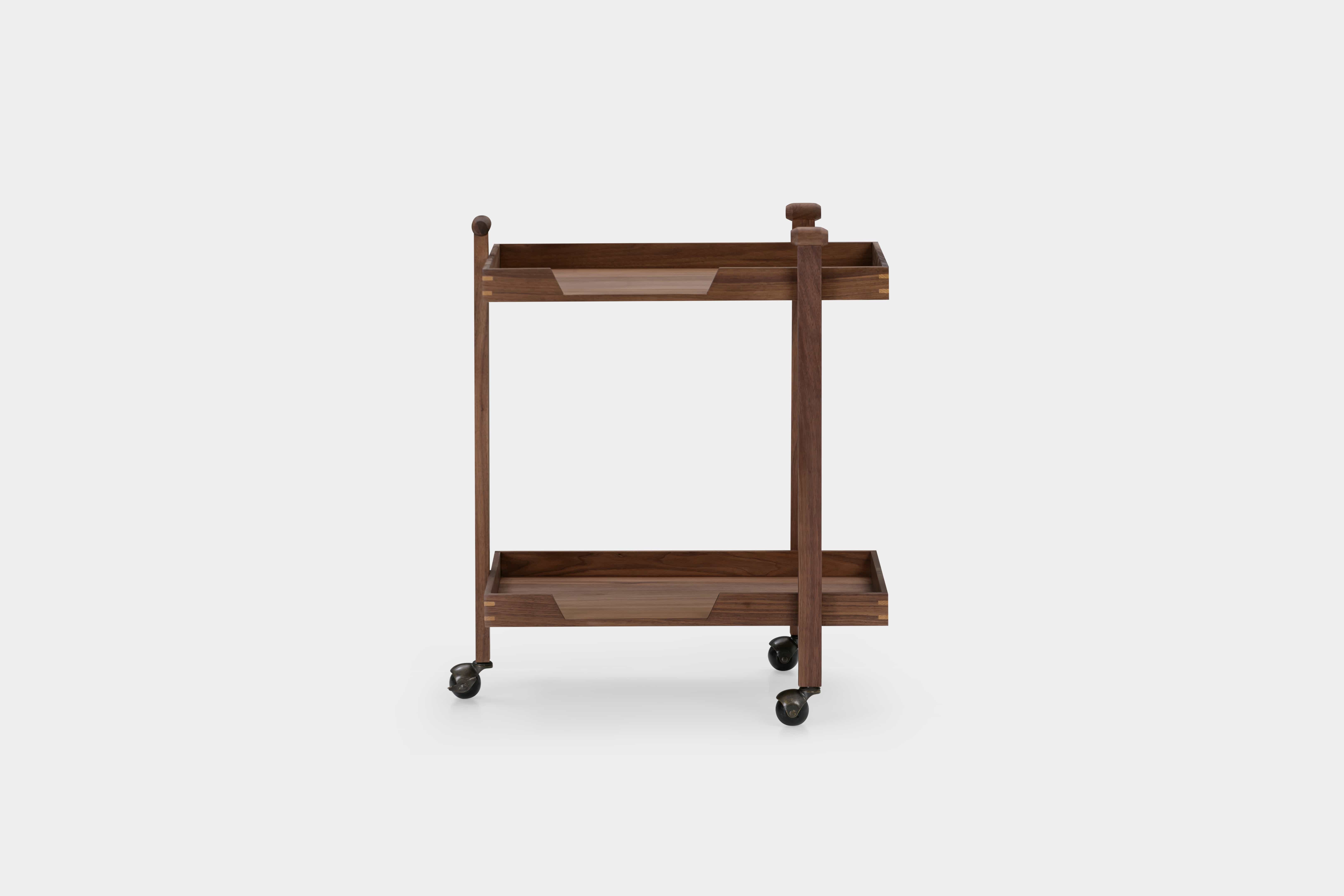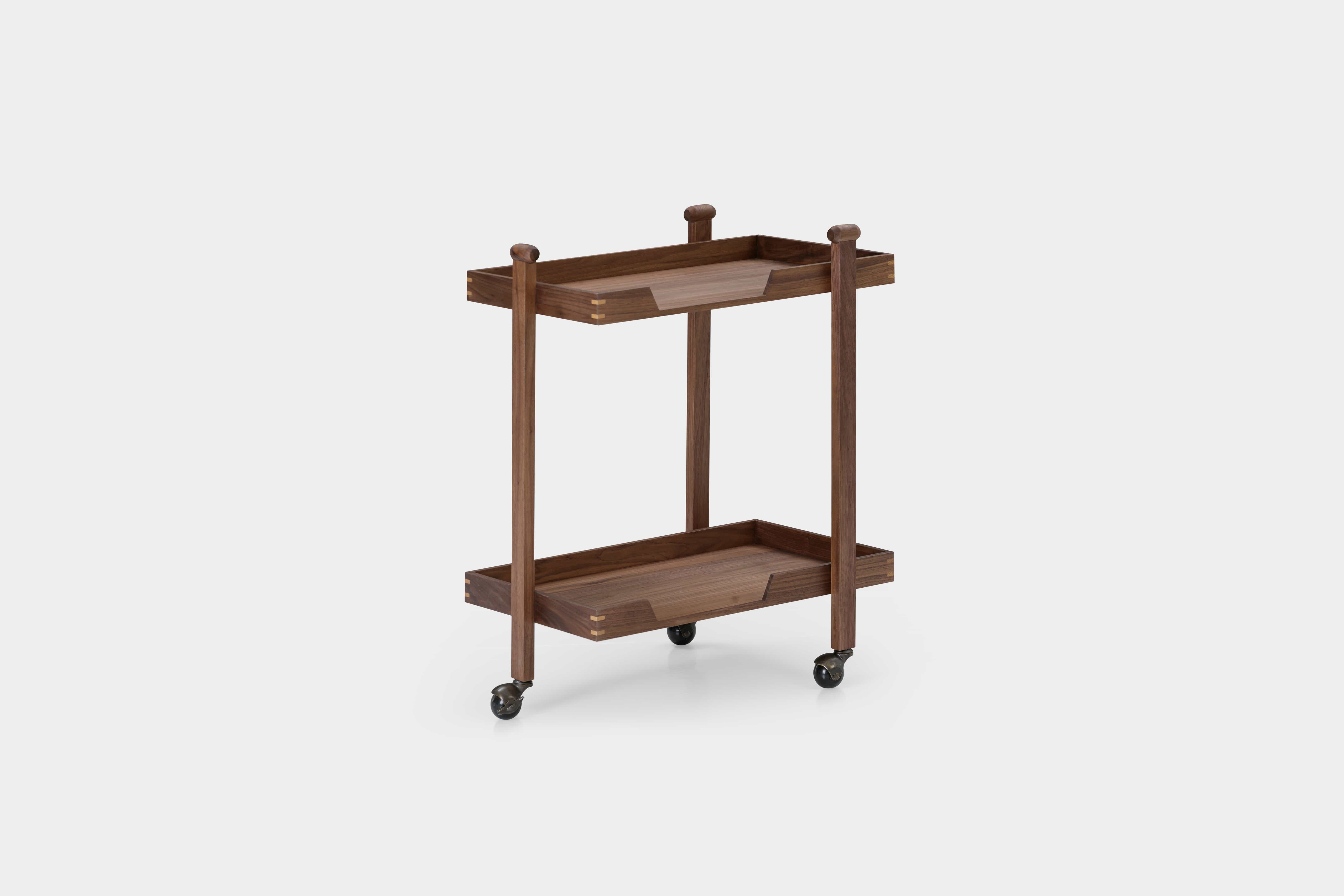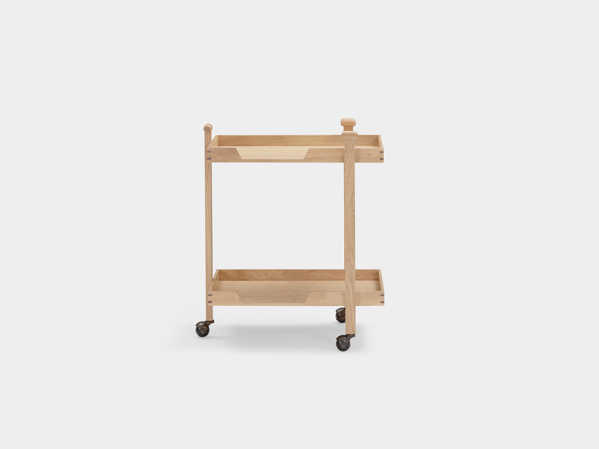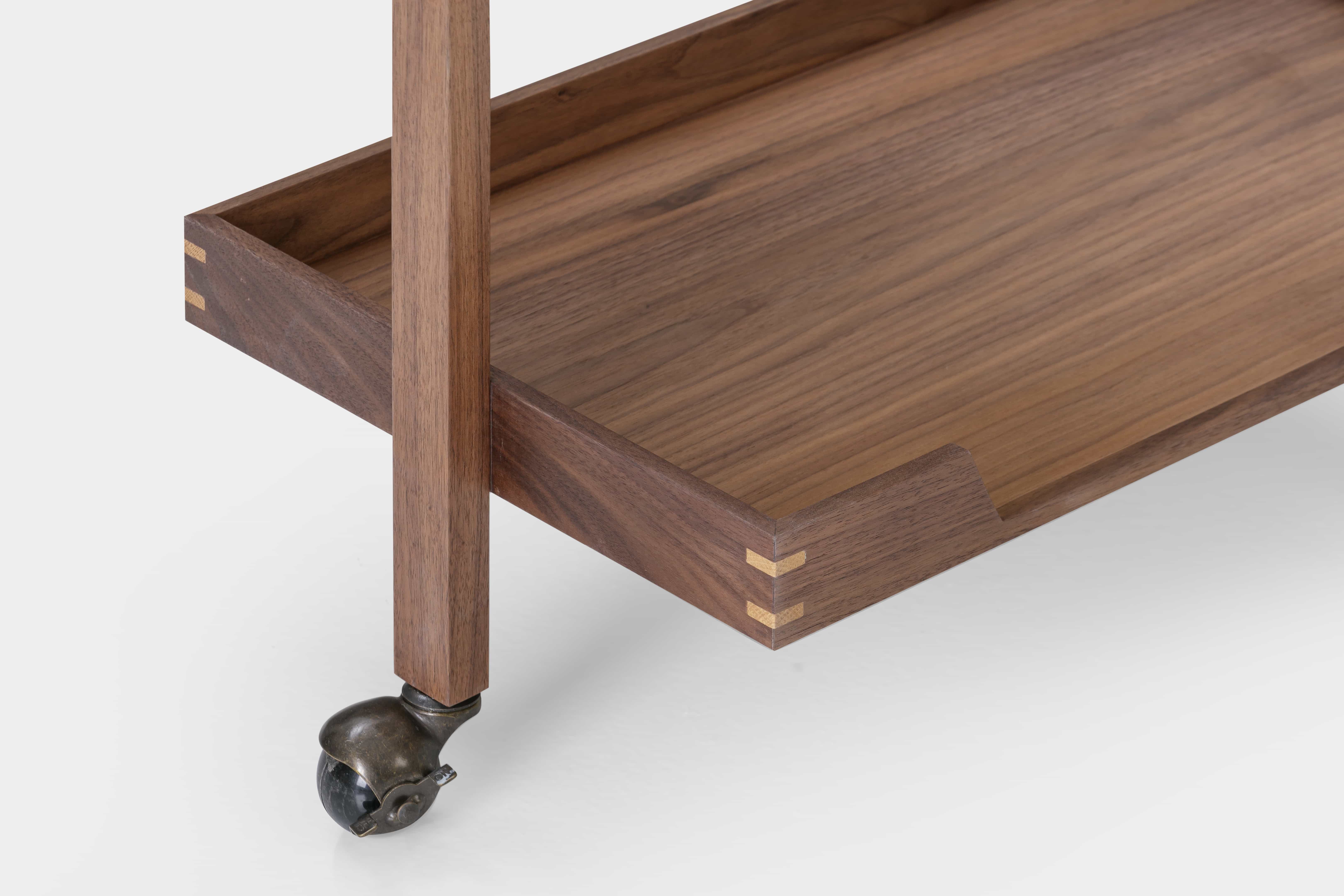 The Arch trolley has lockable caster wheels in an antique brass finish. The timber trays are fixed and have a contrasting timber joinery.