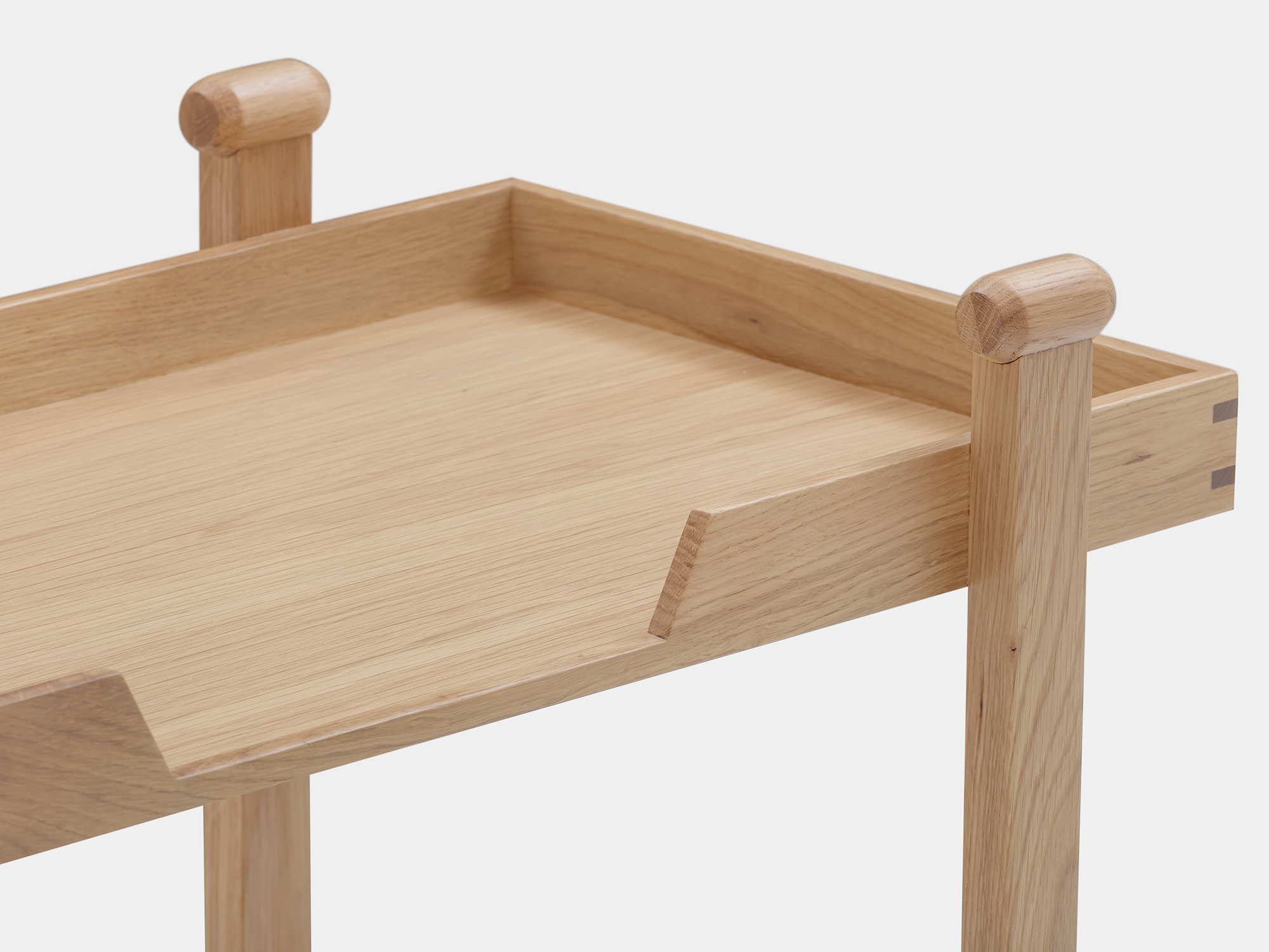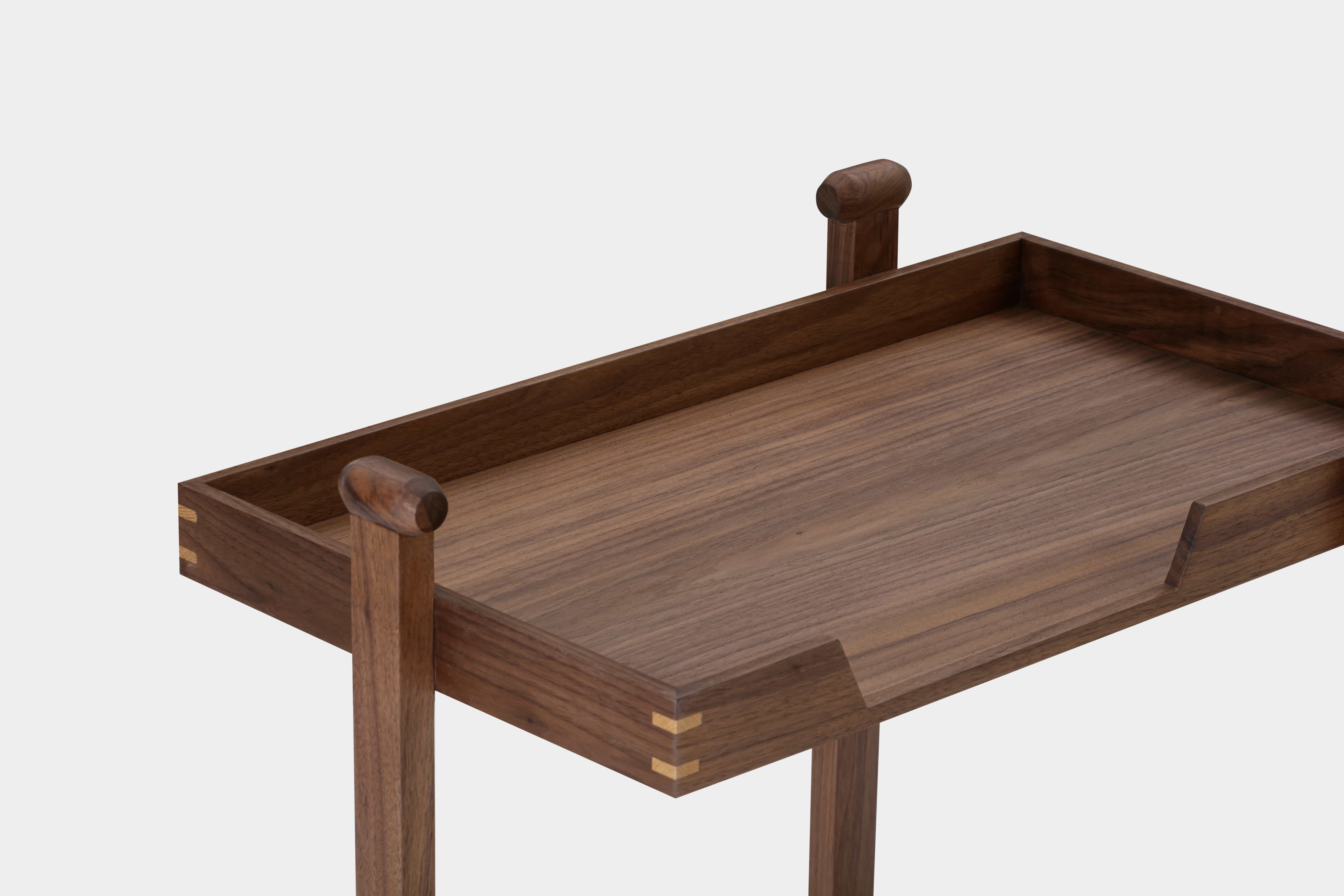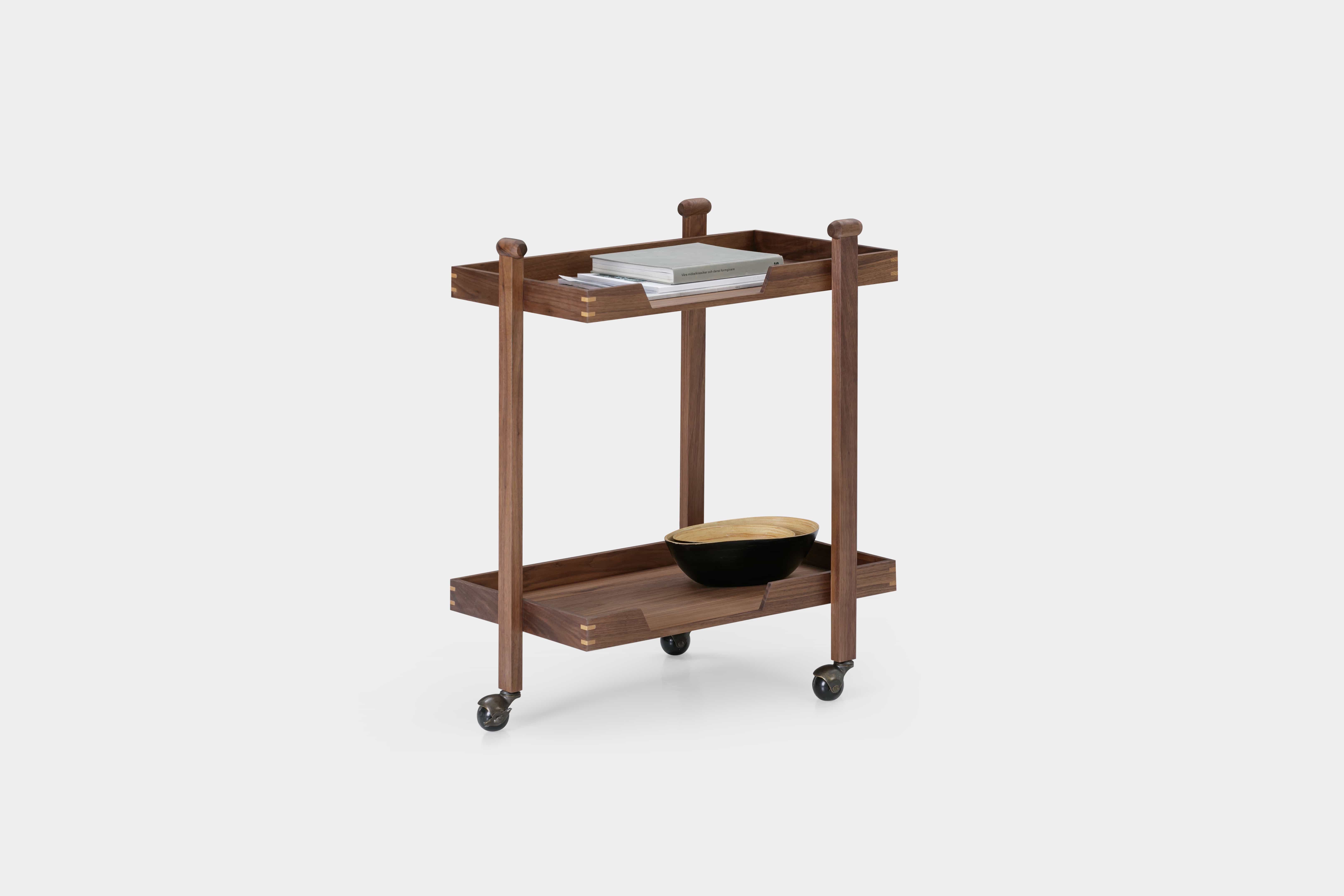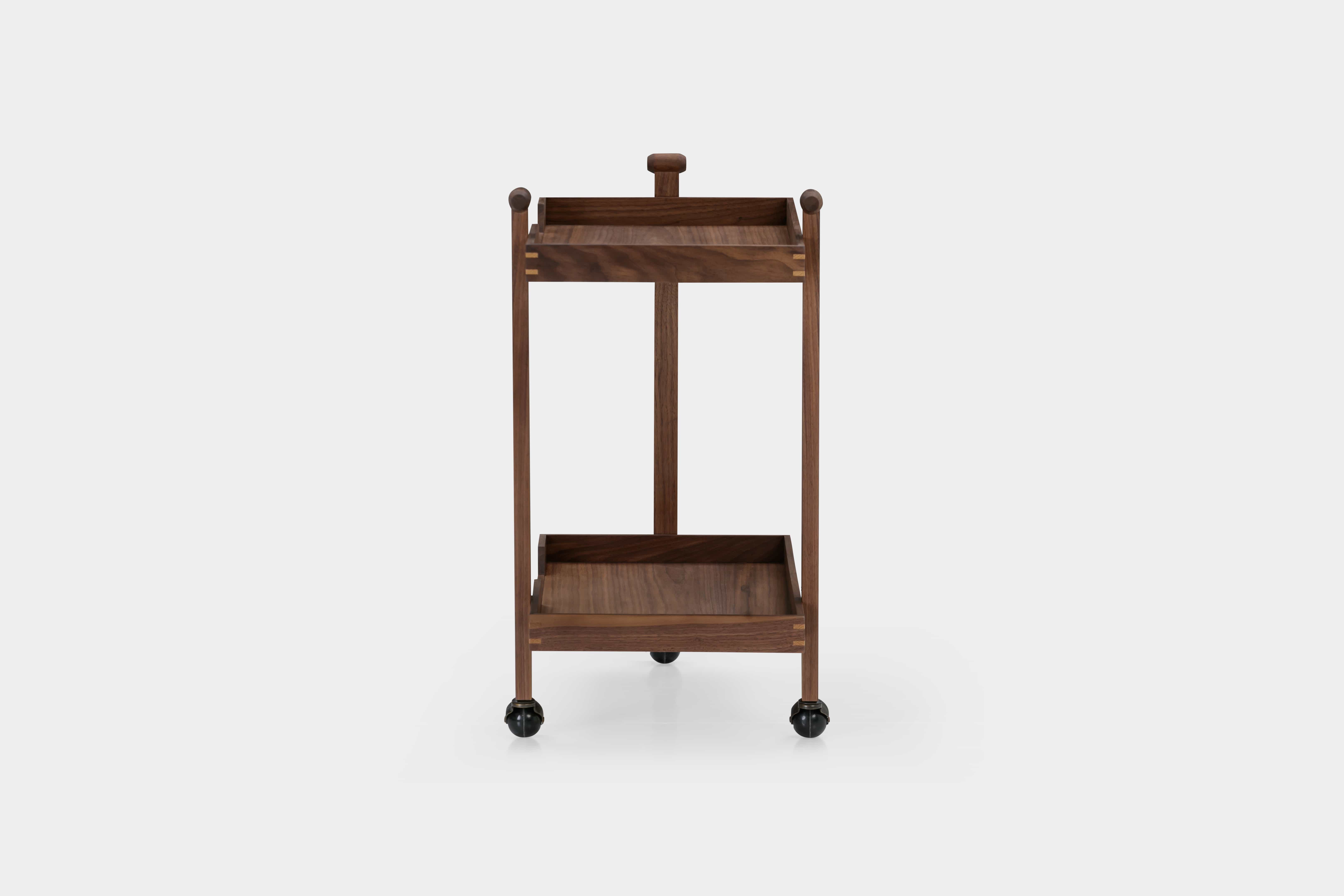 The Arch trolley has lockable caster wheels in an antique brass finish. The timber trays are fixed and have a contrasting timber joinery.
