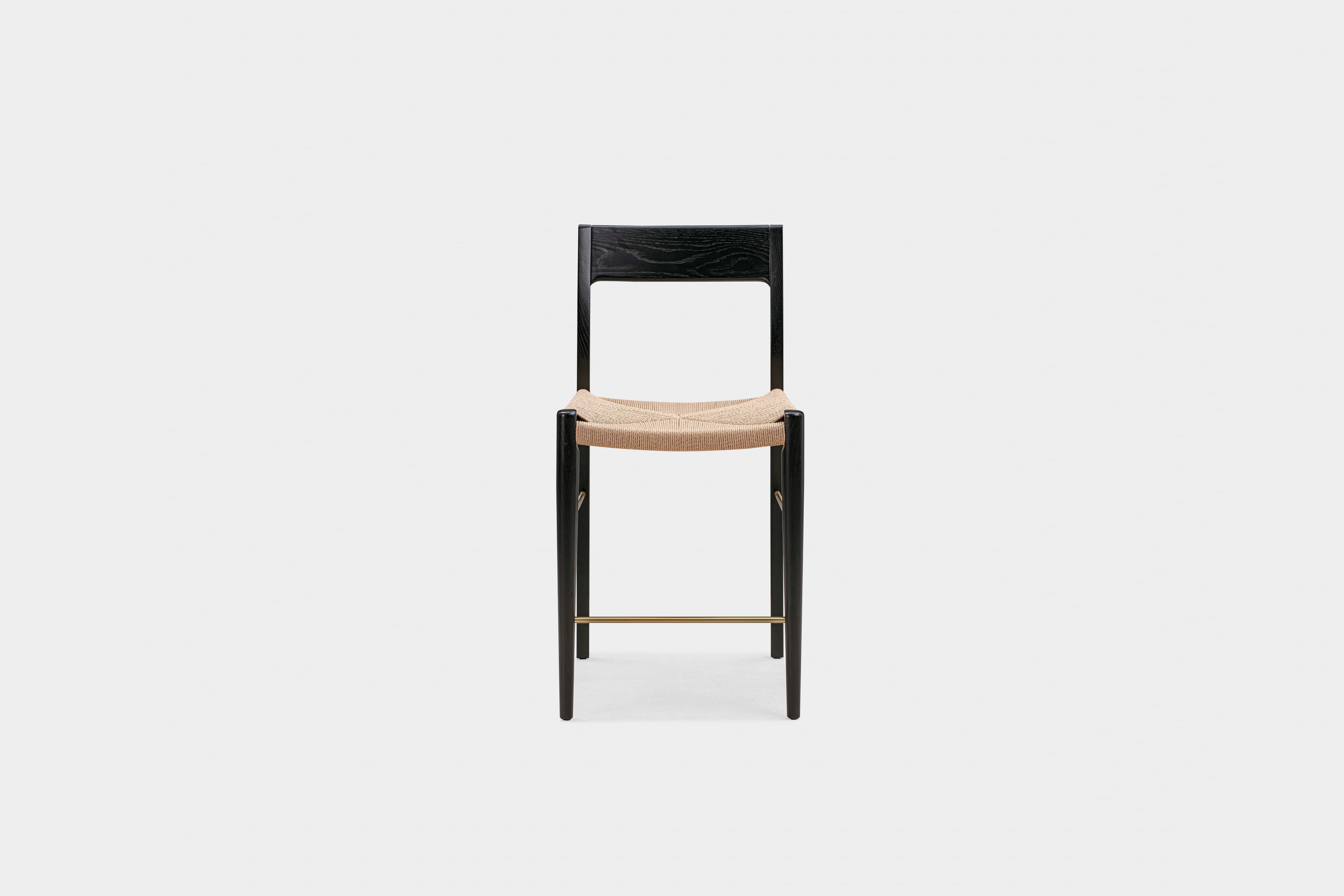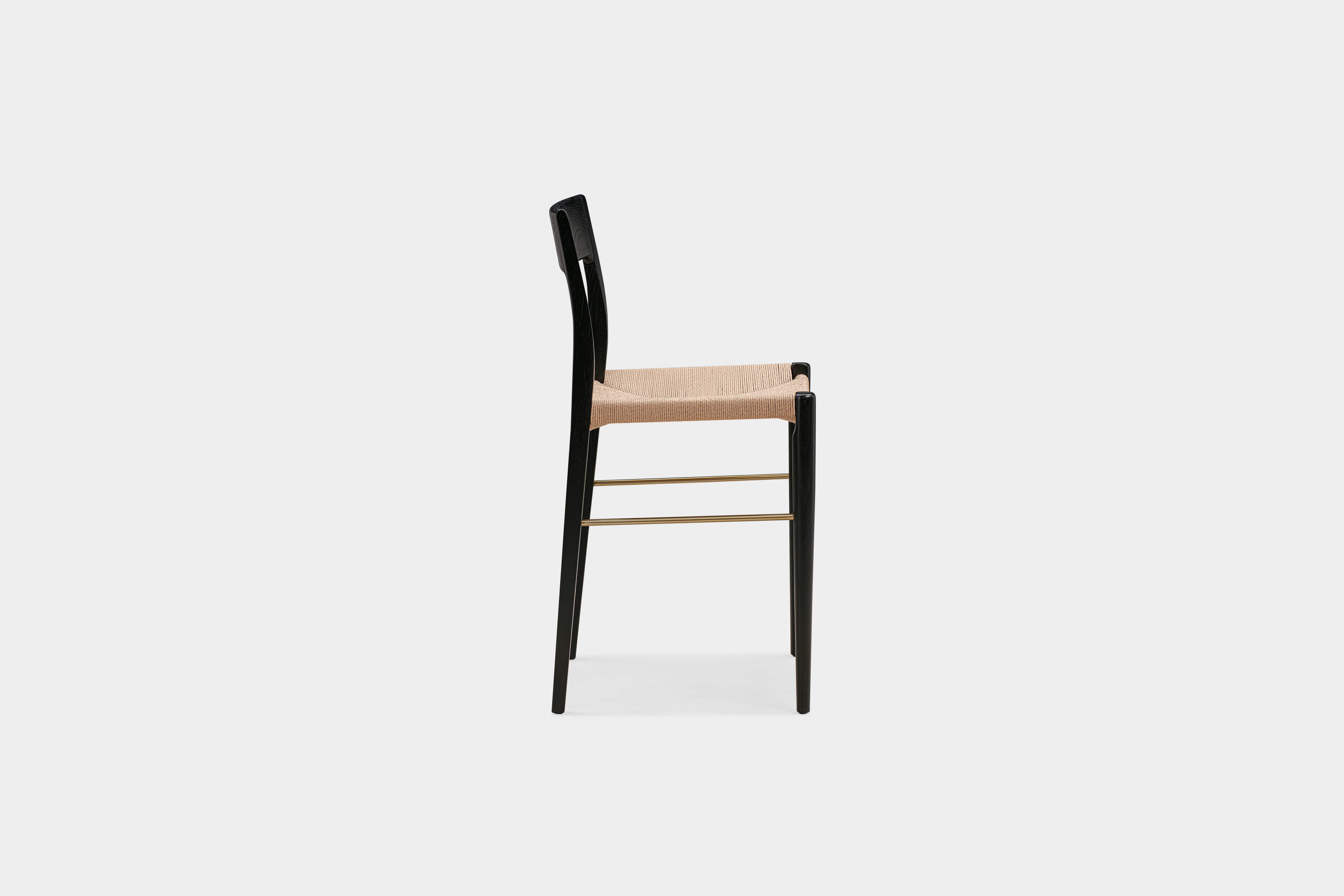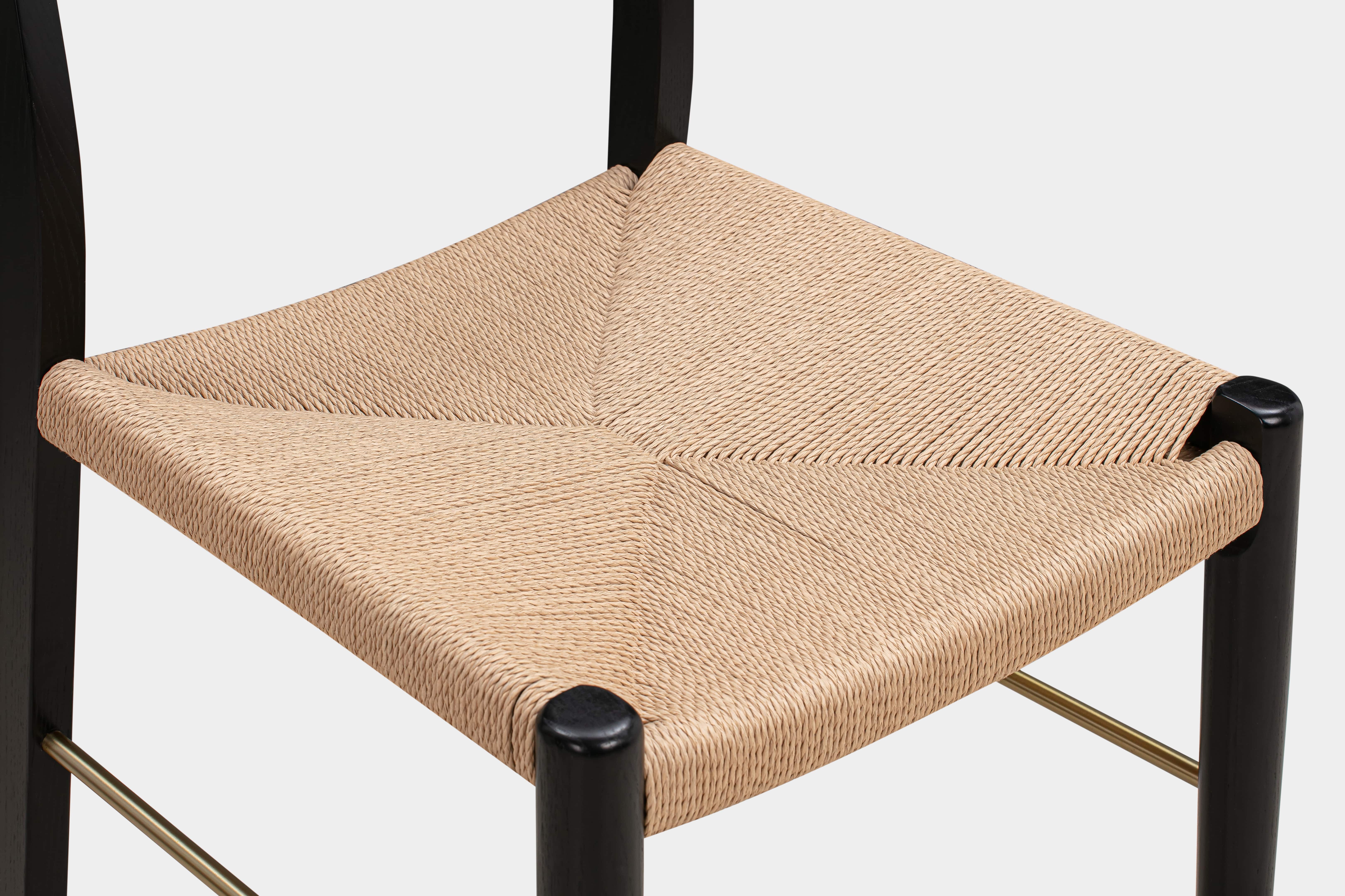 Counter and barstool with natural rope seat weaving and brass painted metal stretchers.