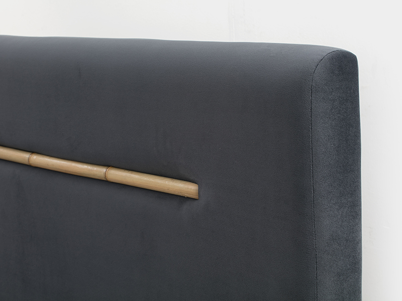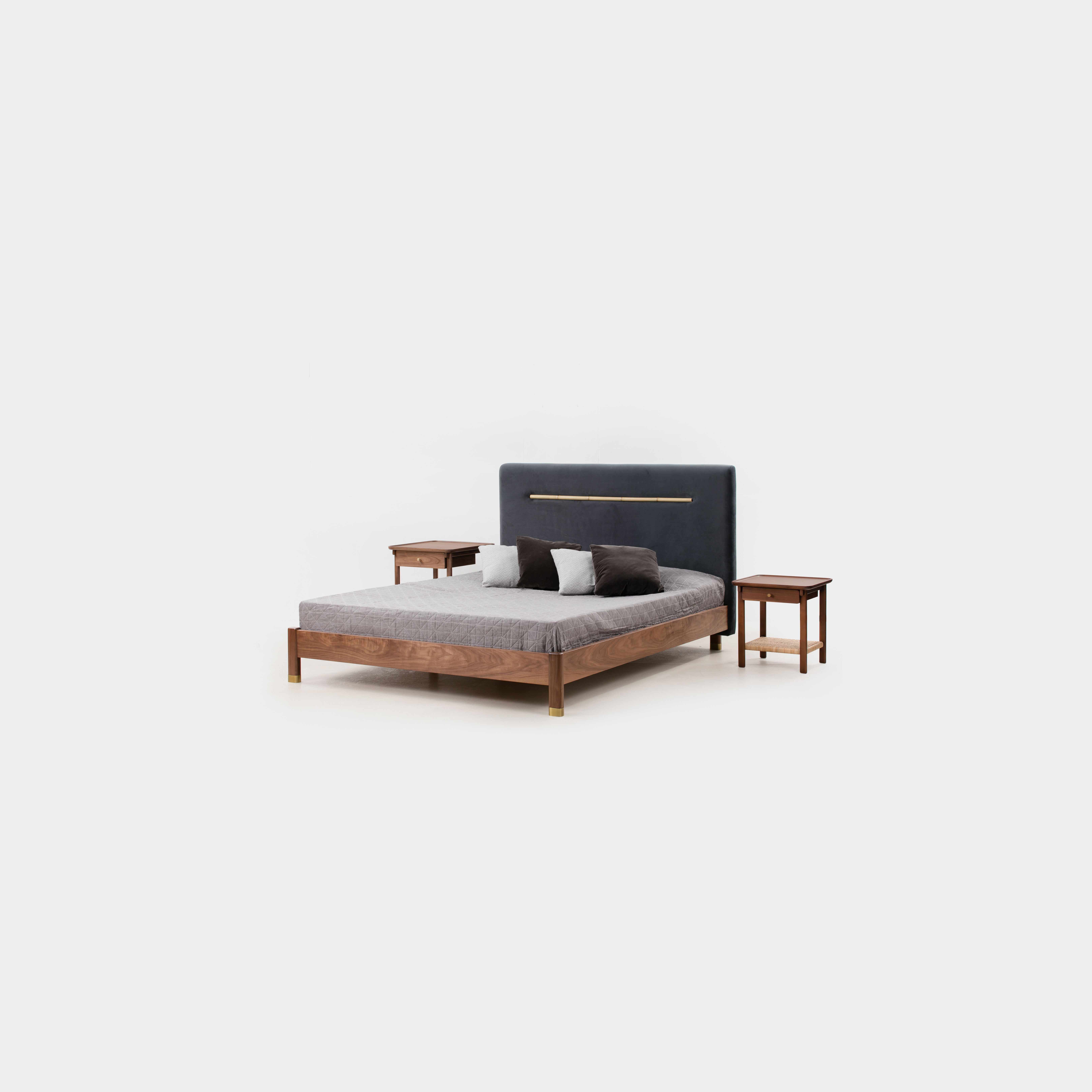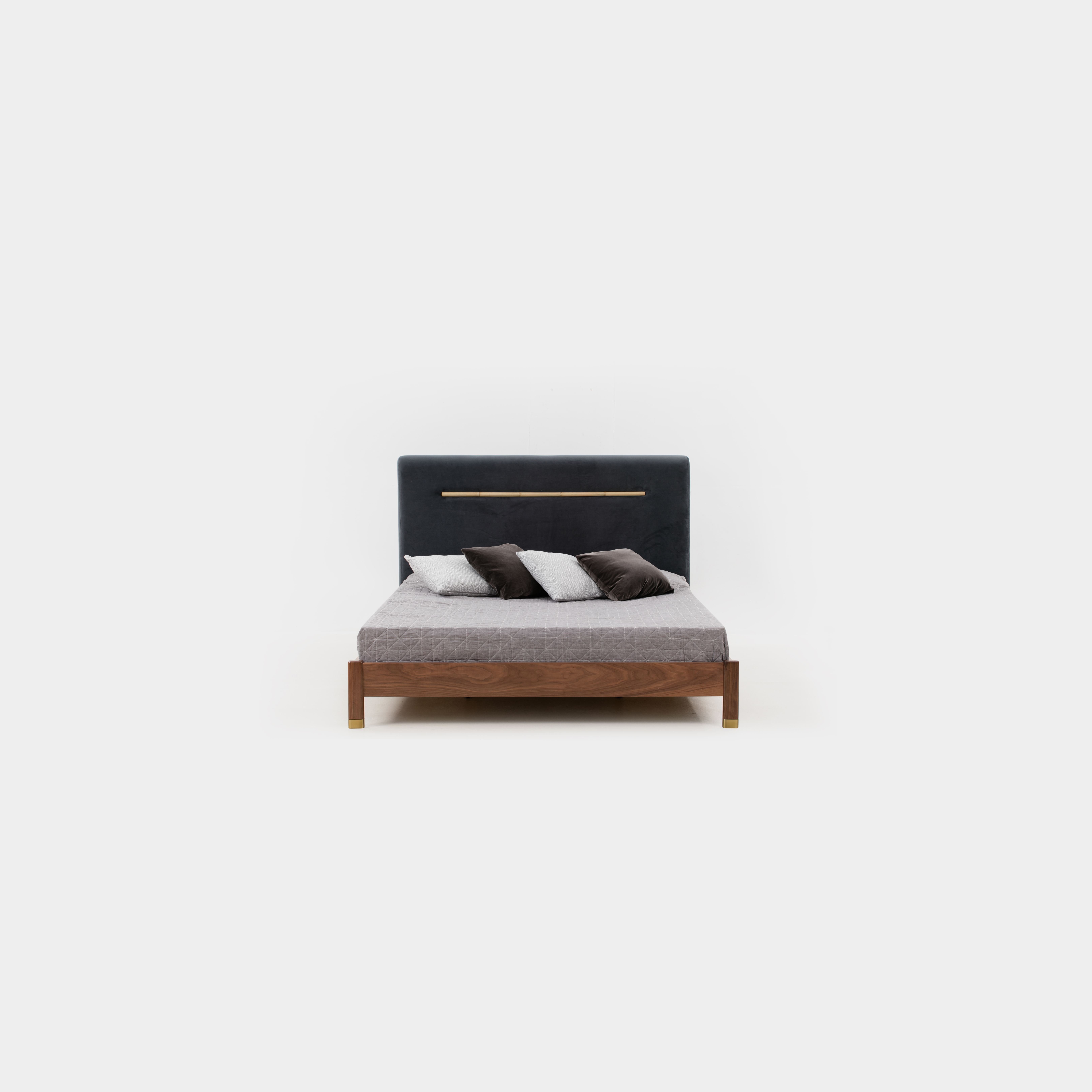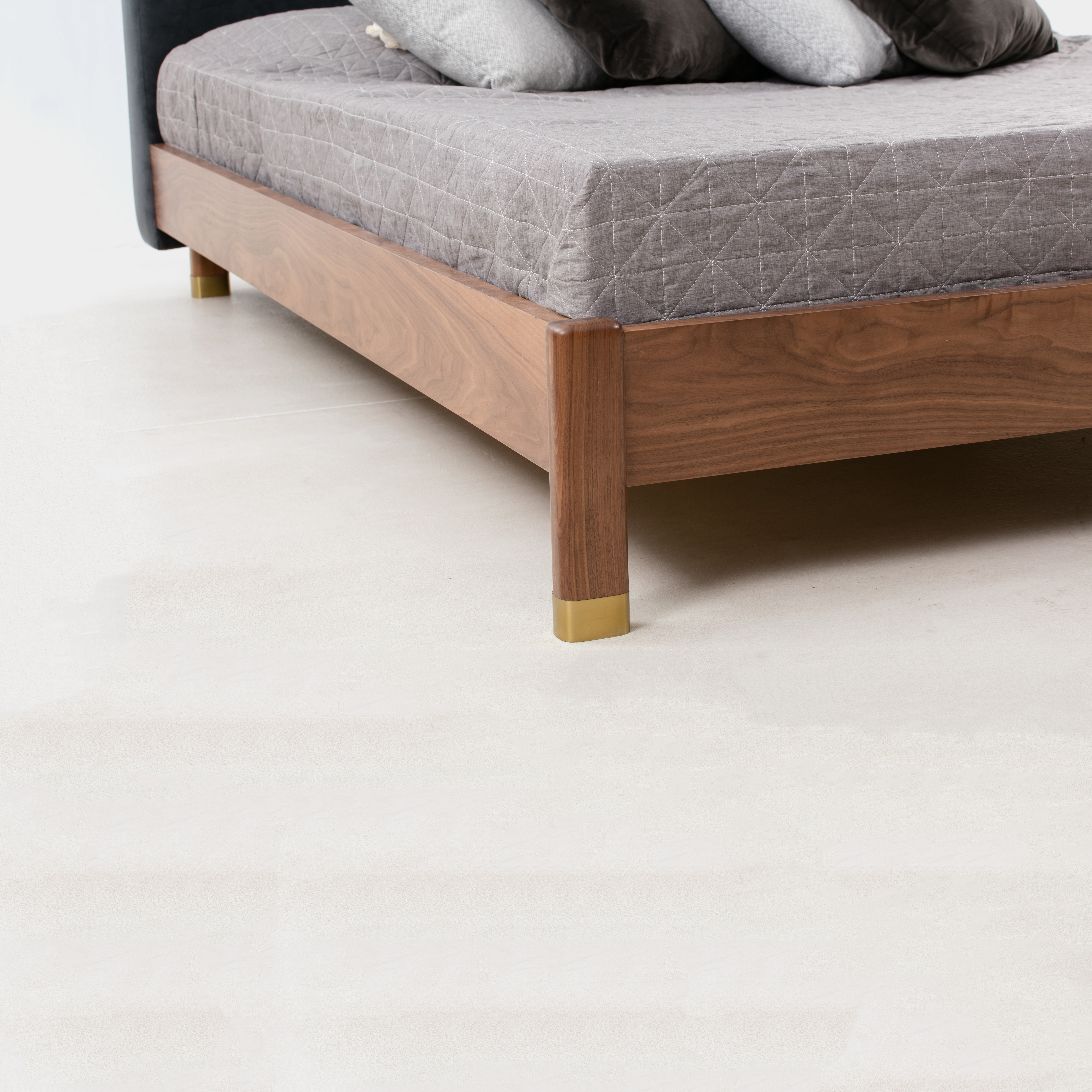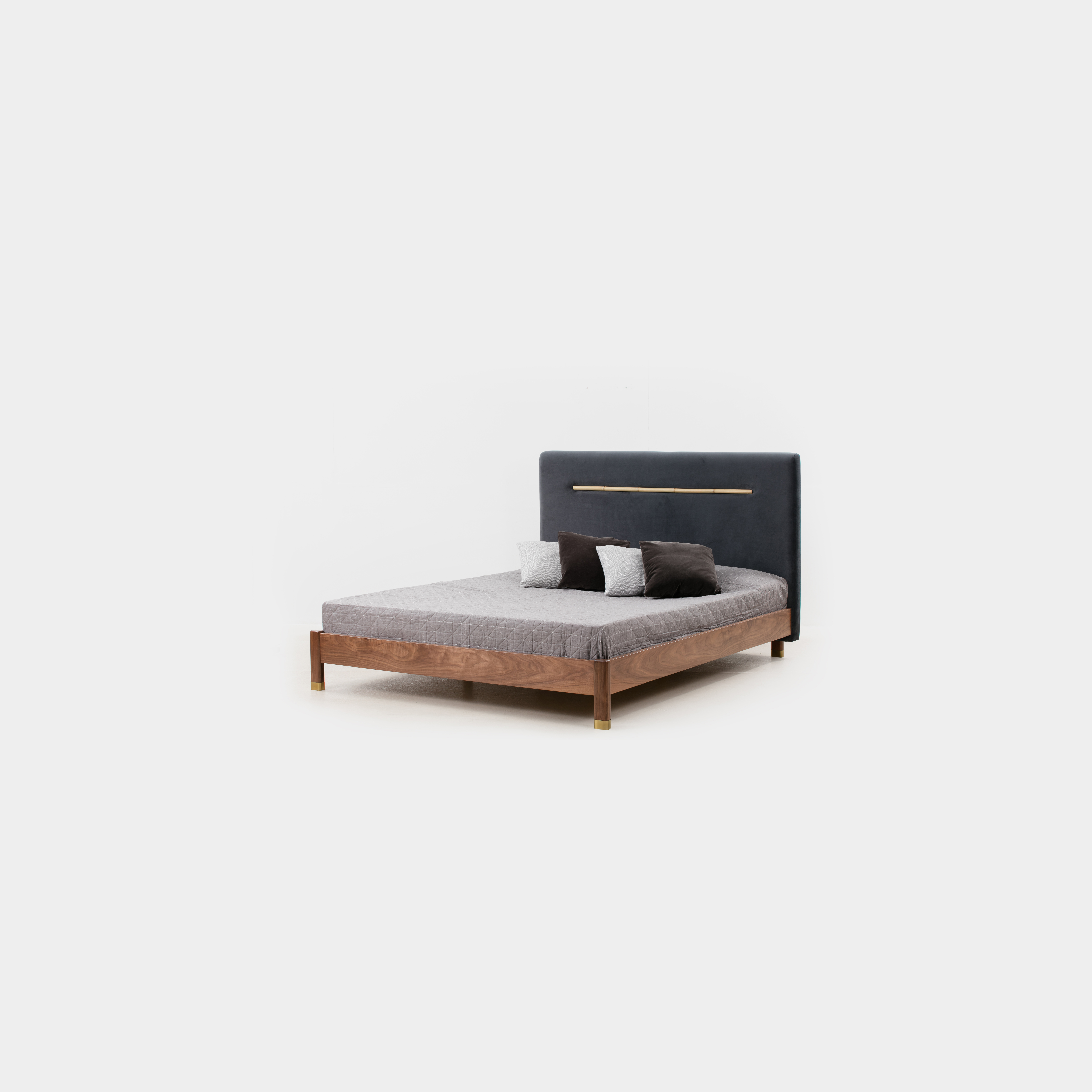 Saigon bedframe with upholstered headboard and brass leg caps. Optional bamboo tufting for headboard. Design by Mathieu Gustavsson.