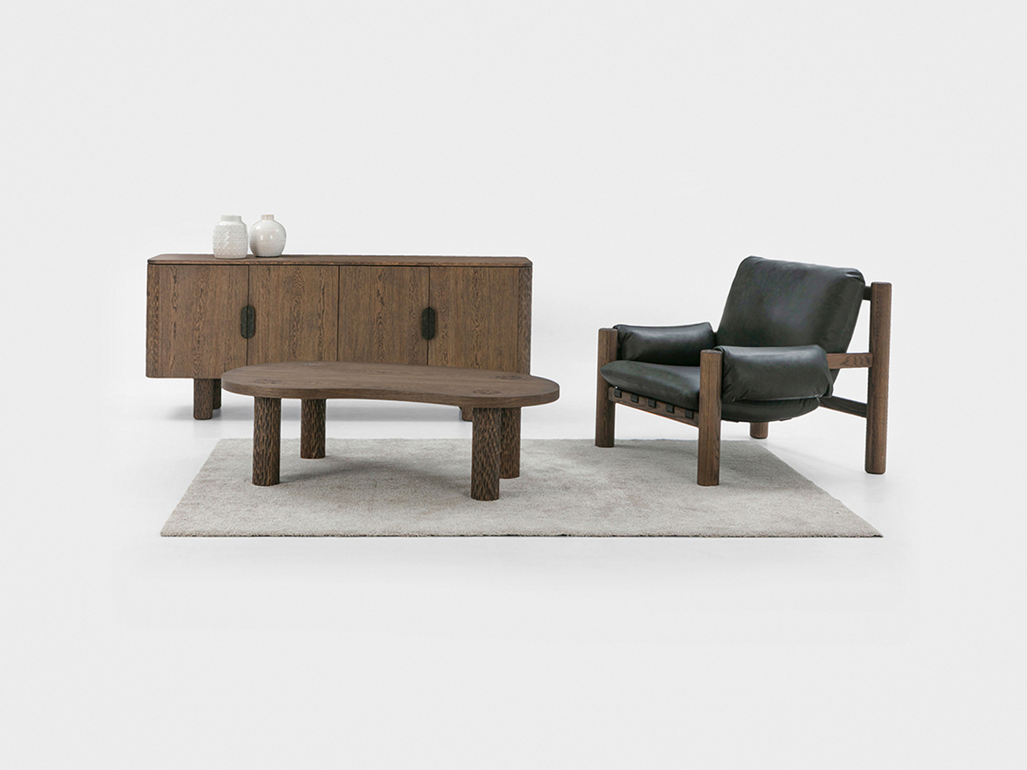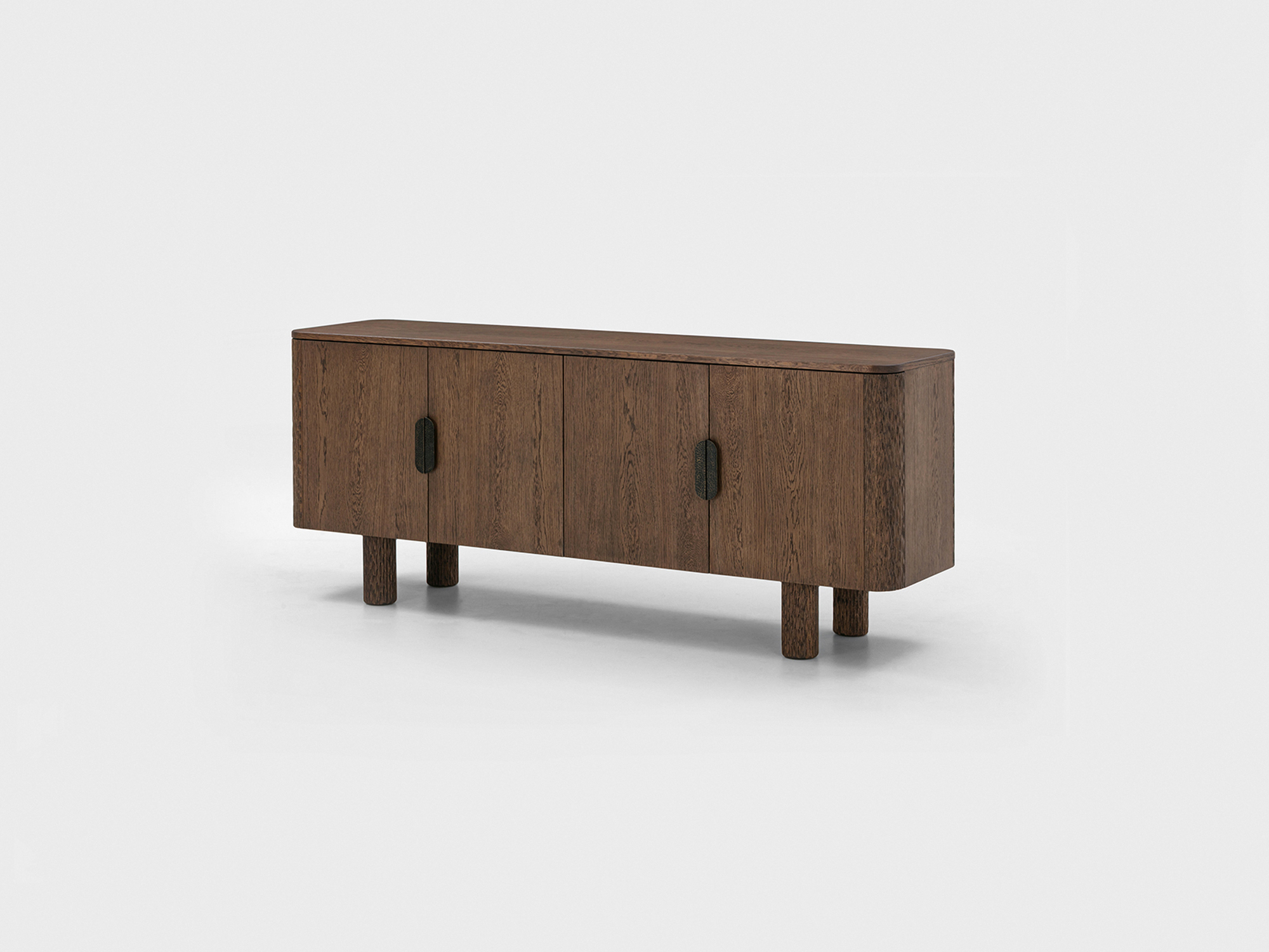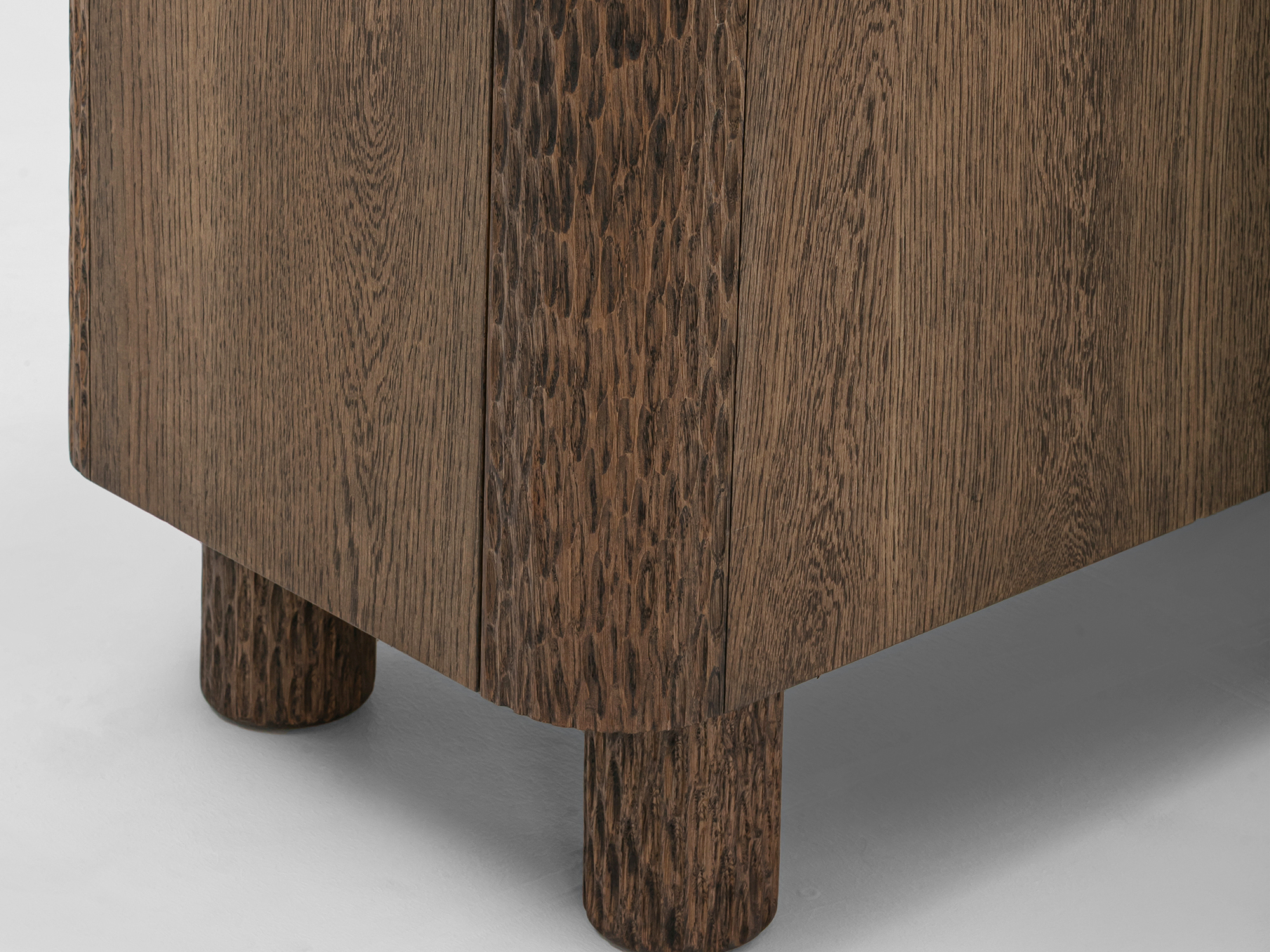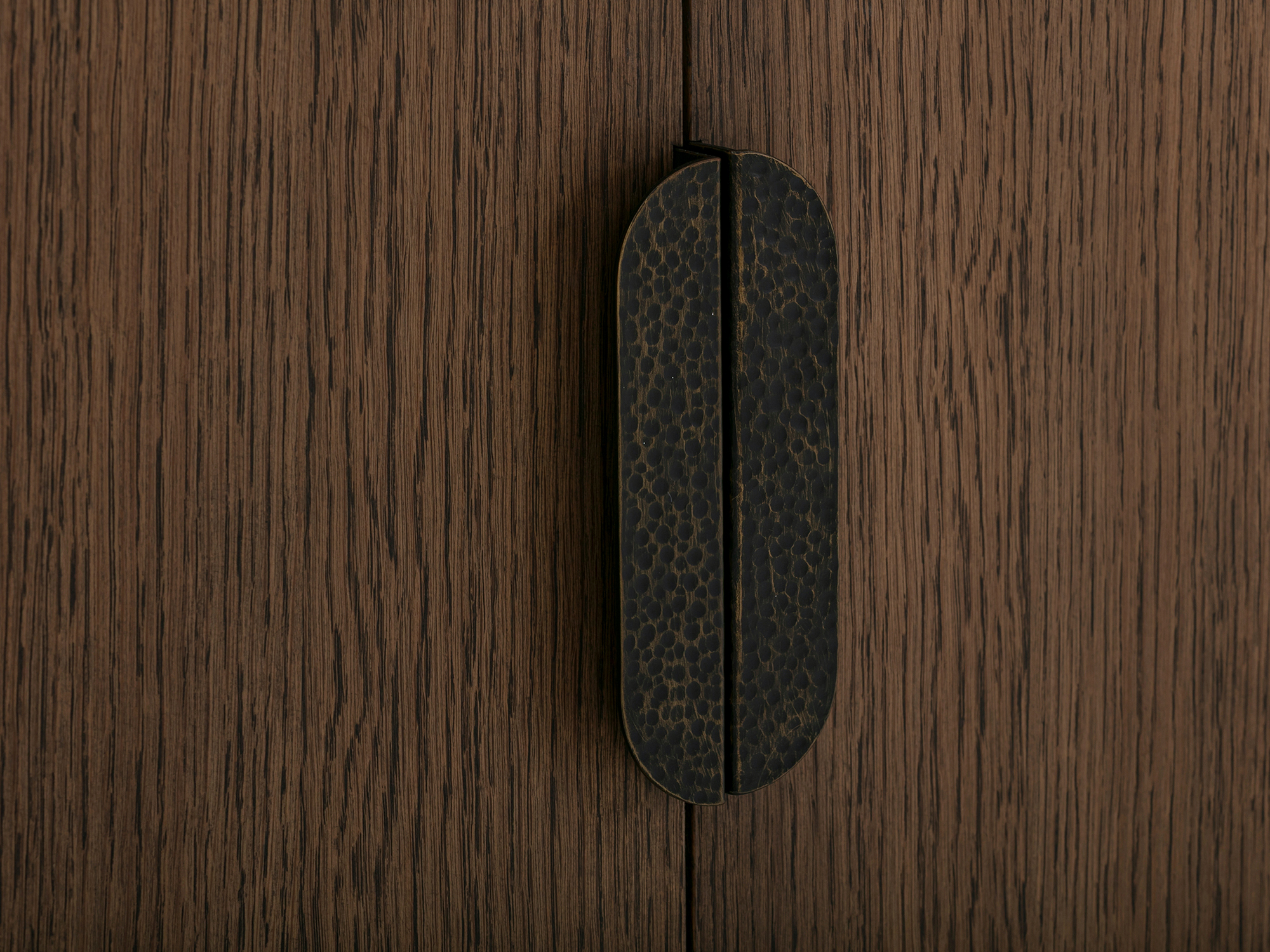 The Carver sideboard is distinguished by its elegant proportions and the hand-carved pattern on the curved cabinet sides, adding depth and sophistication. The handles feature a hammered bronze finish.