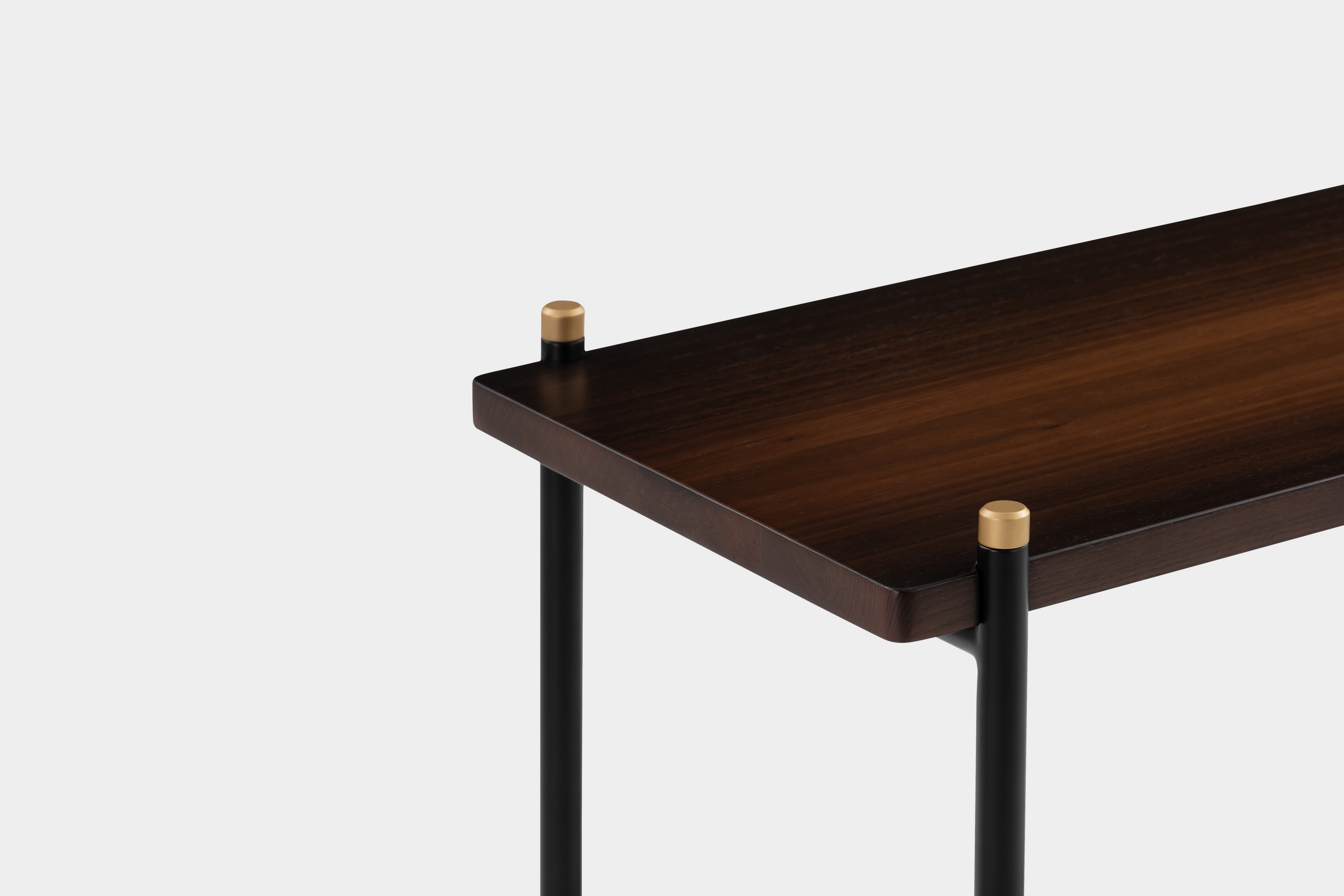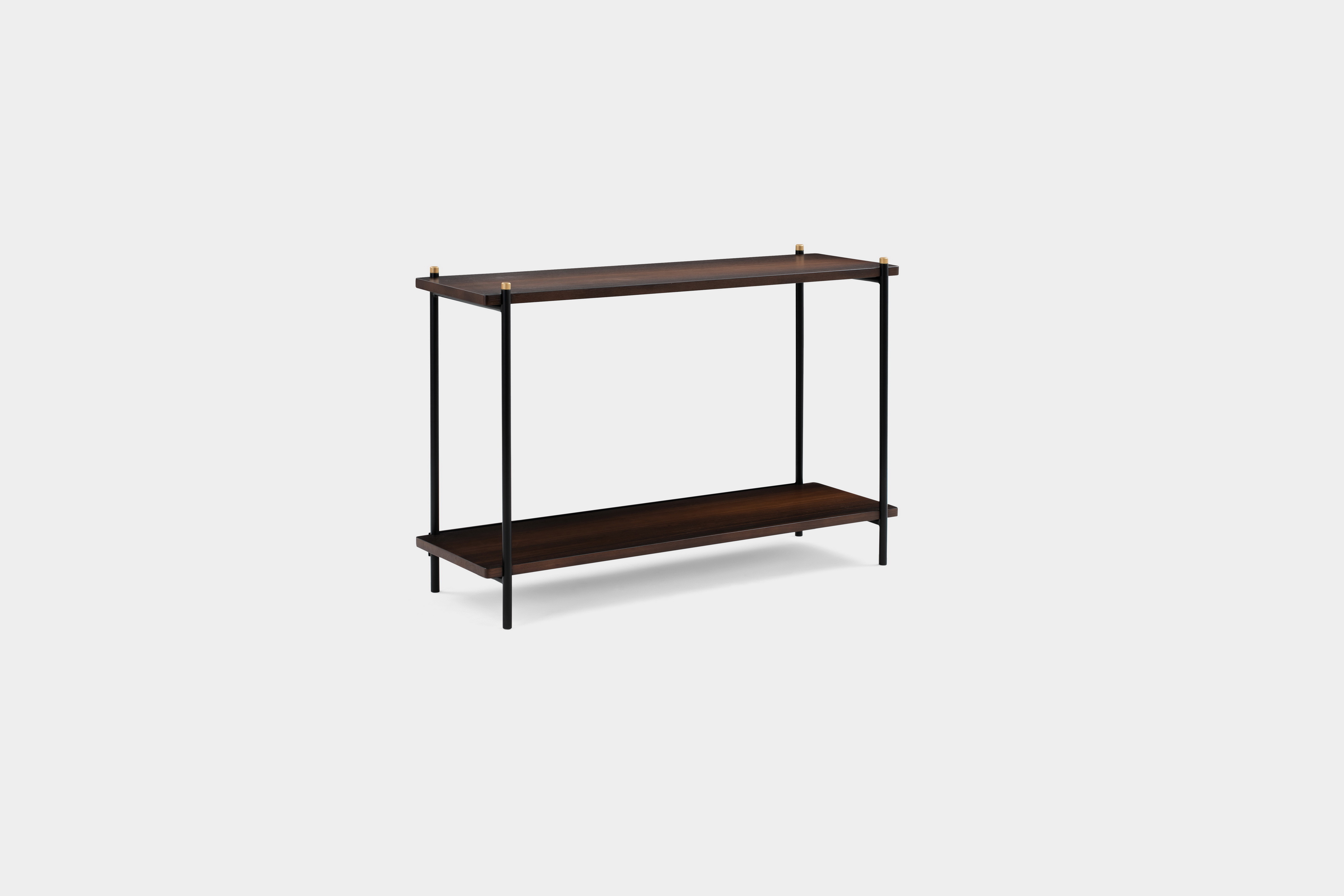 The Cabo console table with timber shelves and metal frame. Available in matt black or brushed steel metal base. Design by Anders Ostberg.