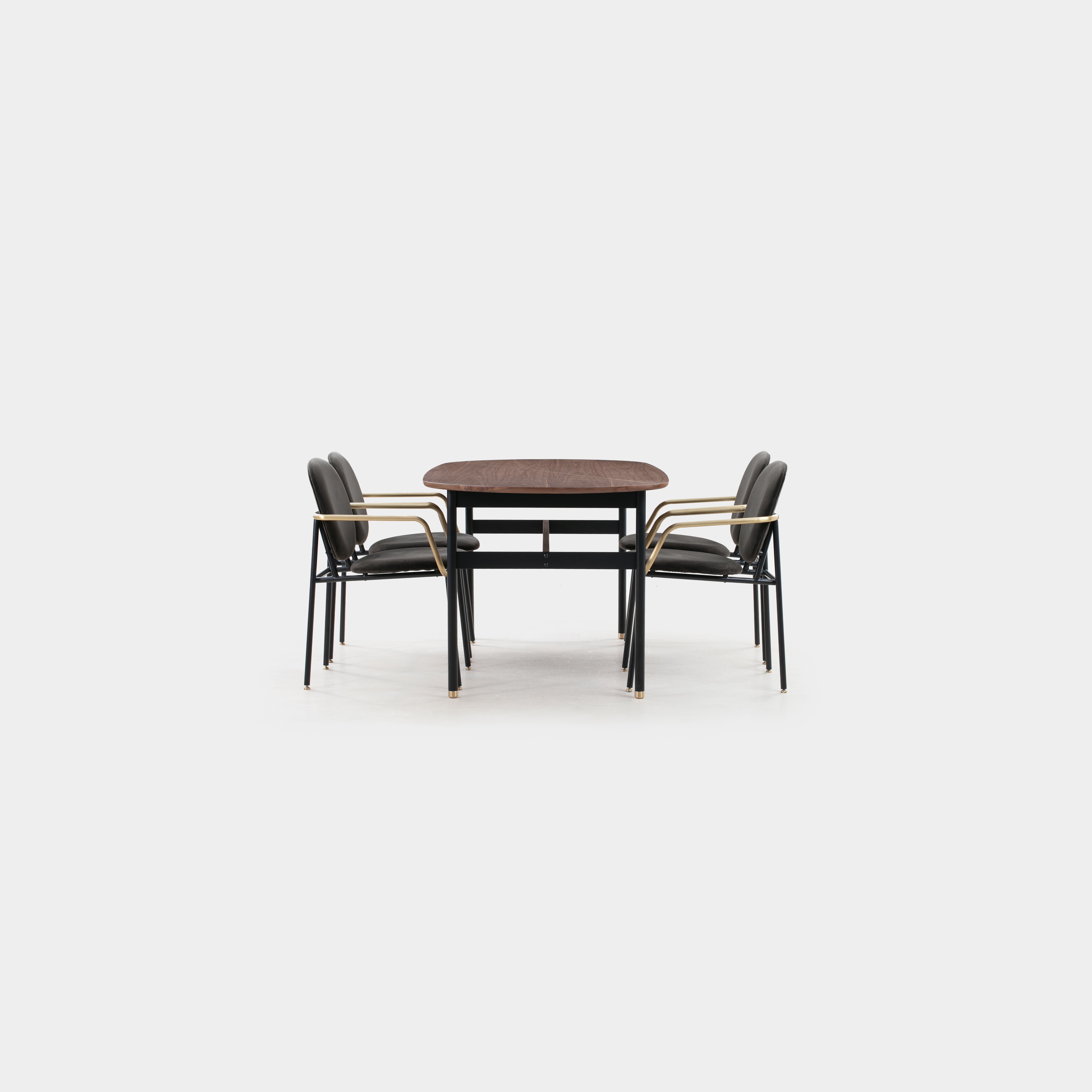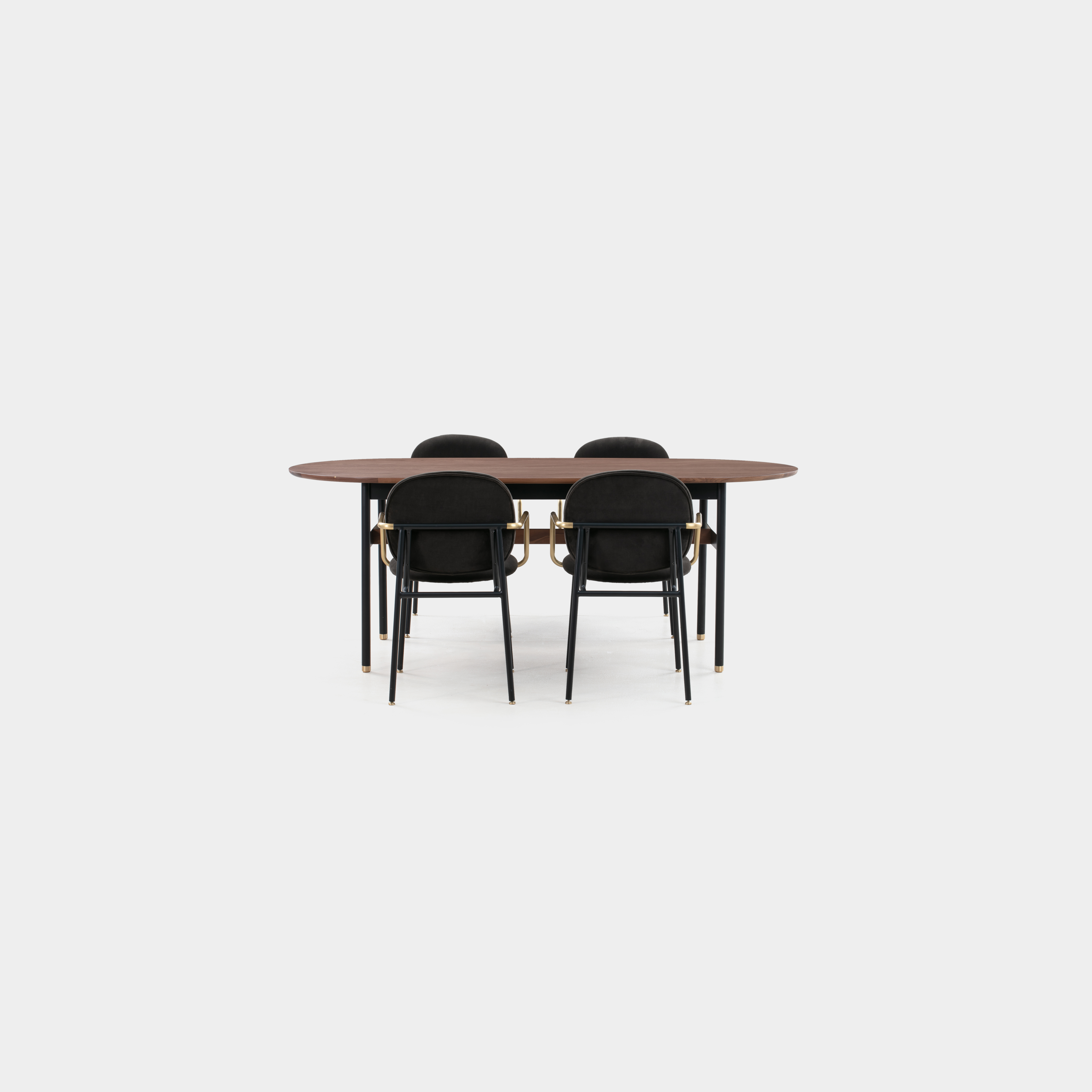The Cabo dining table has an oval shaped table top. The metal base comes with brass painted metal feet. Design by Anders Ostberg.