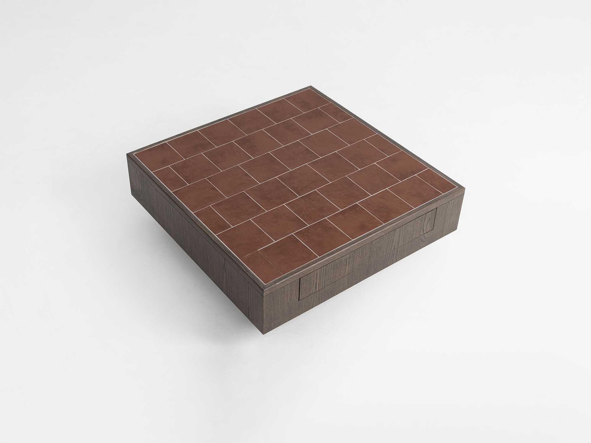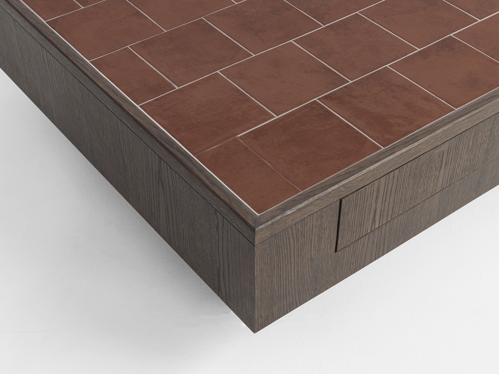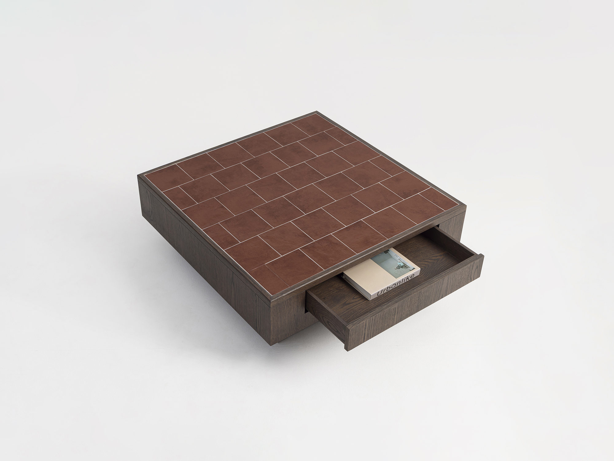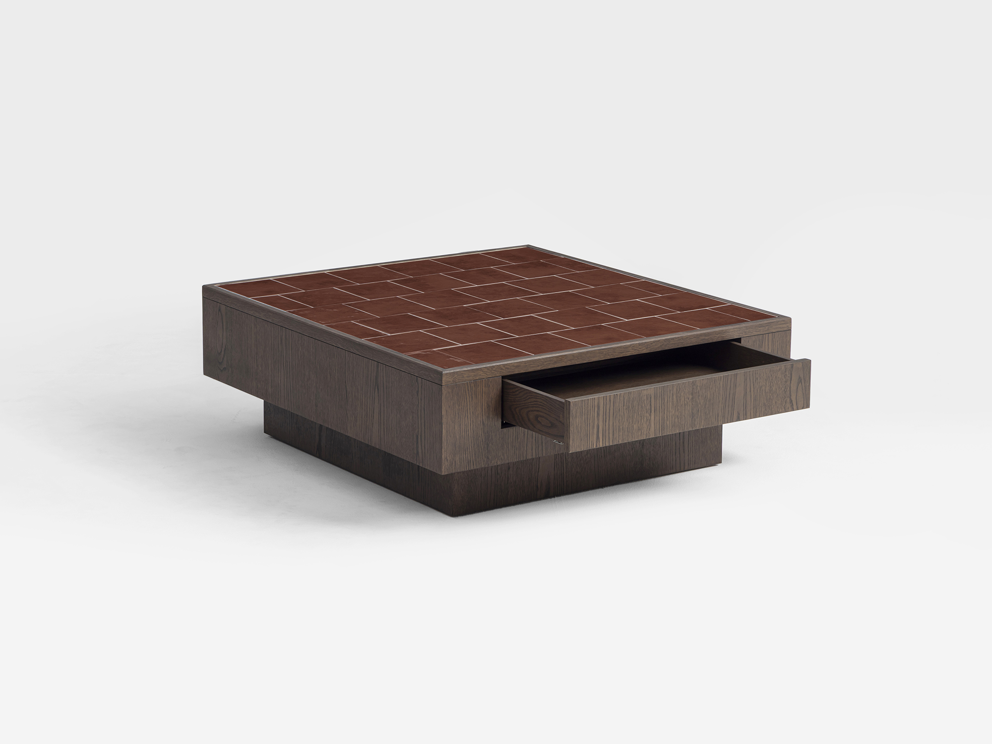 Flow sofa table. A sculptural plinth coffee table crafted in oak veneer with a ceramic tile top. An integrated drawer offers discreet storage while preserving a clean, architectural form.