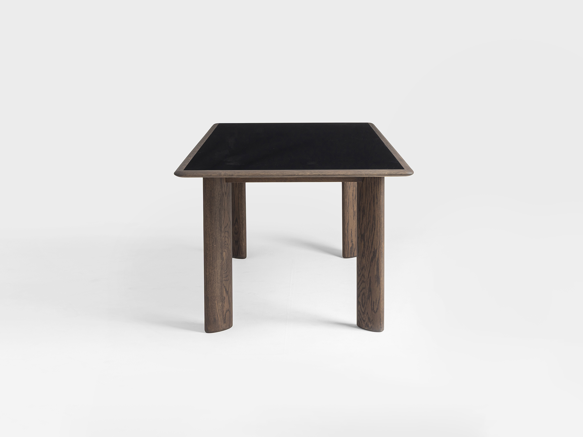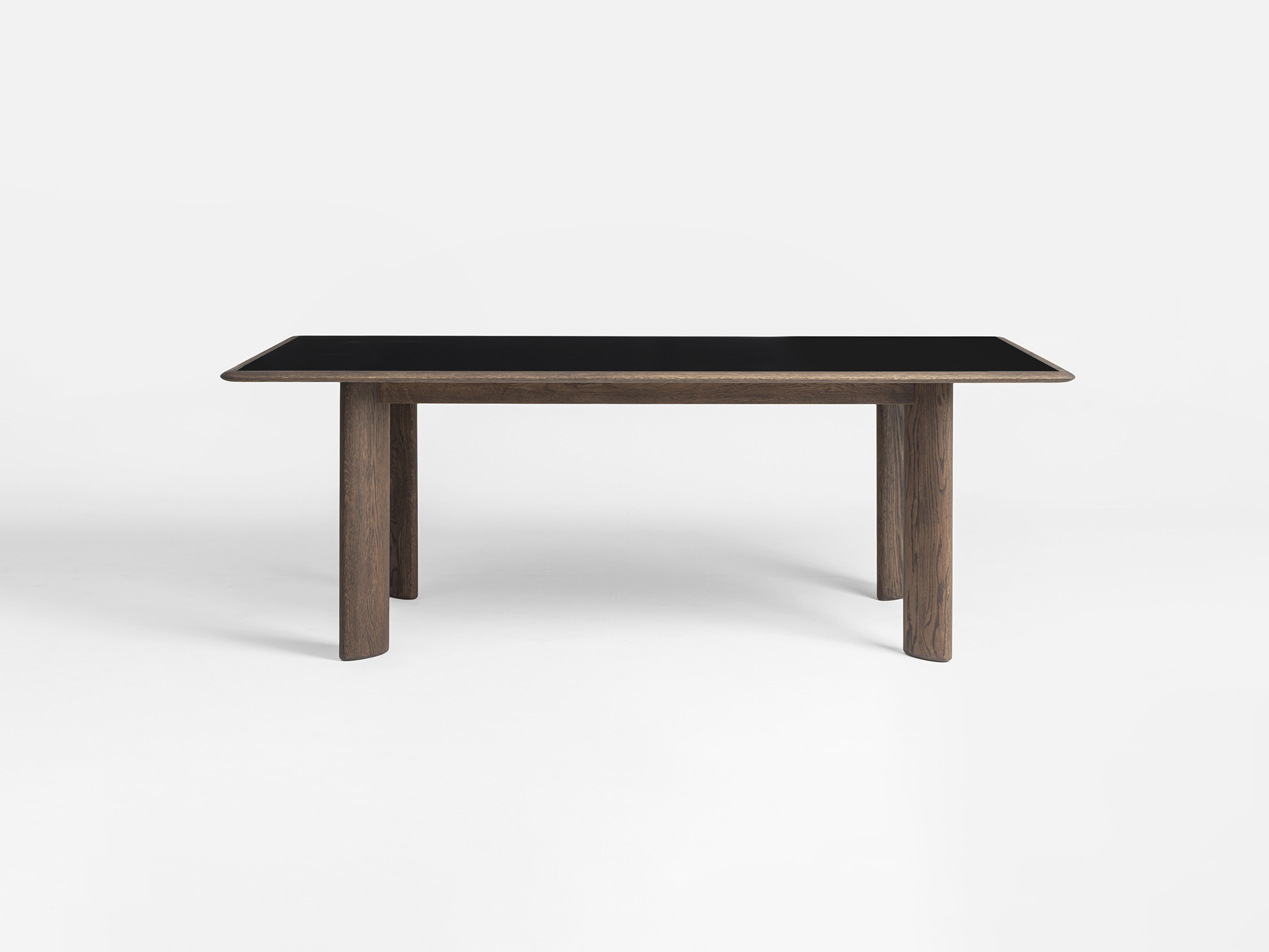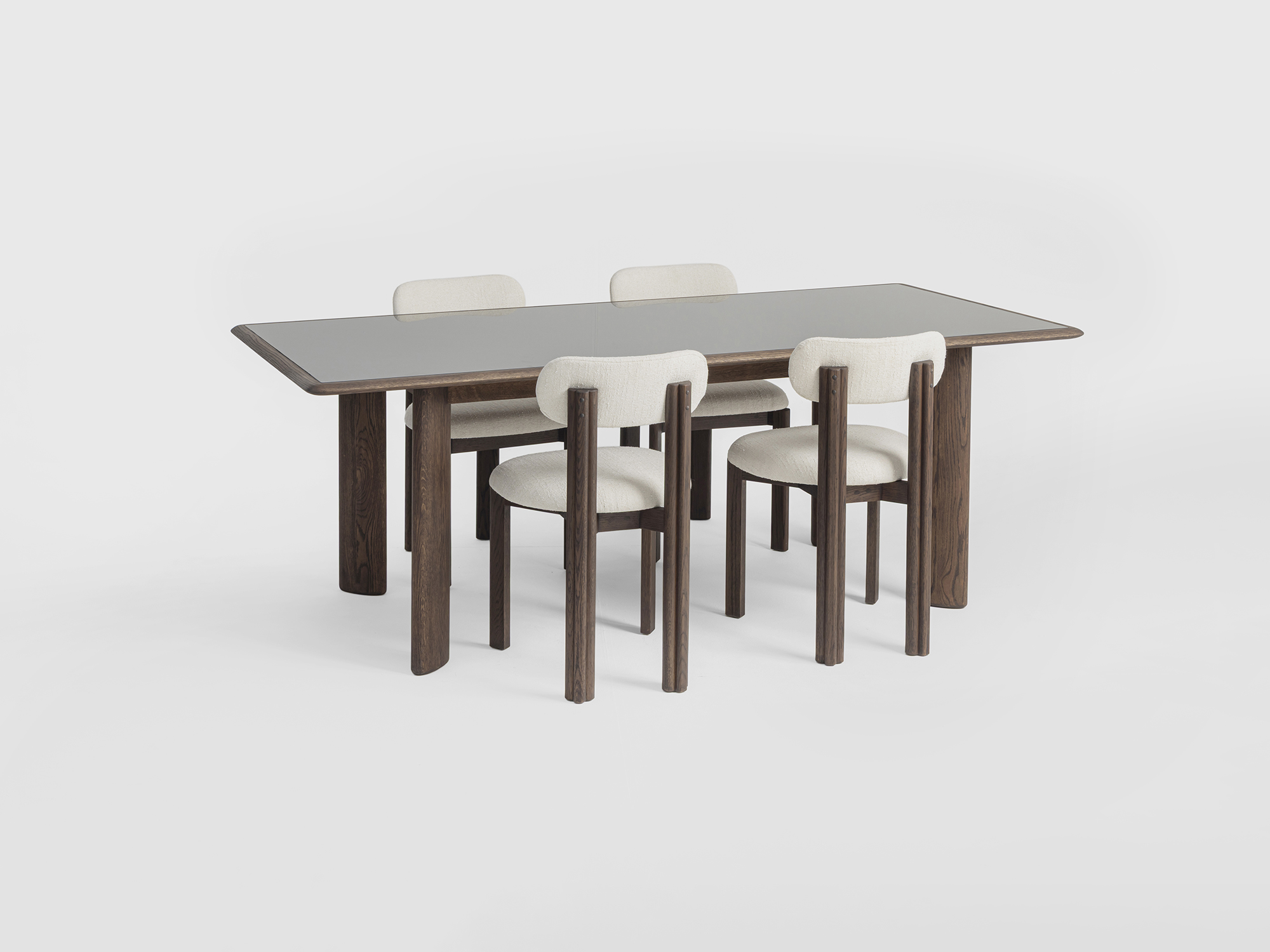 The Flow Dining table is defined by a solid dark oak base with sculpted concave legs and a softly beveled