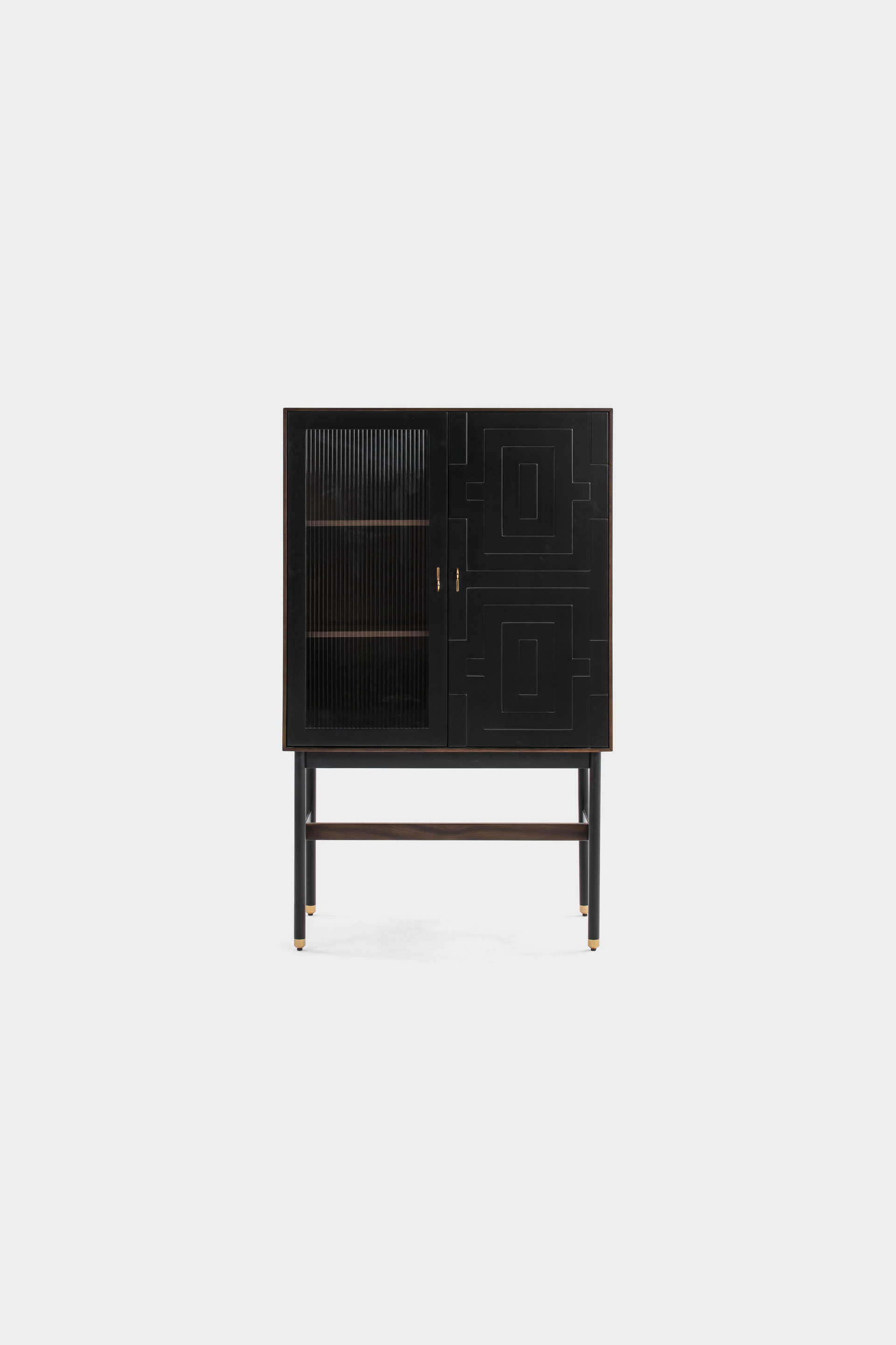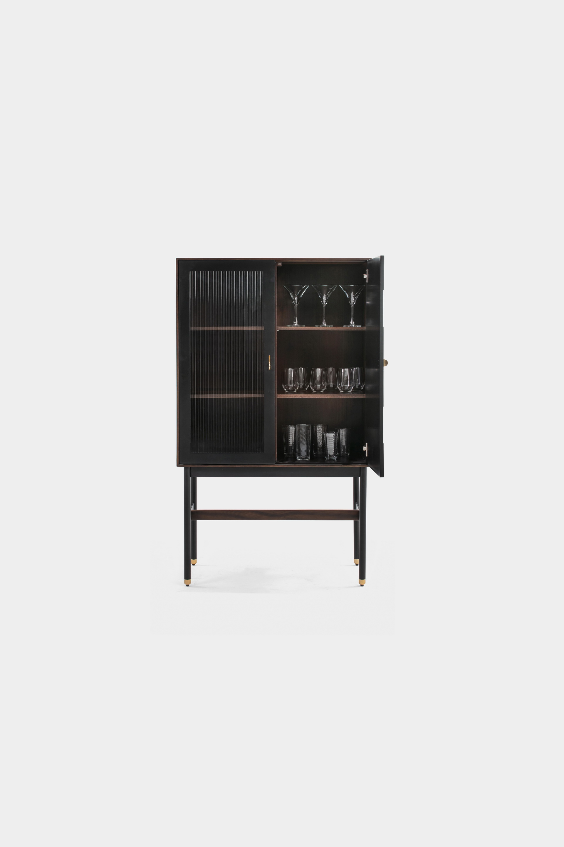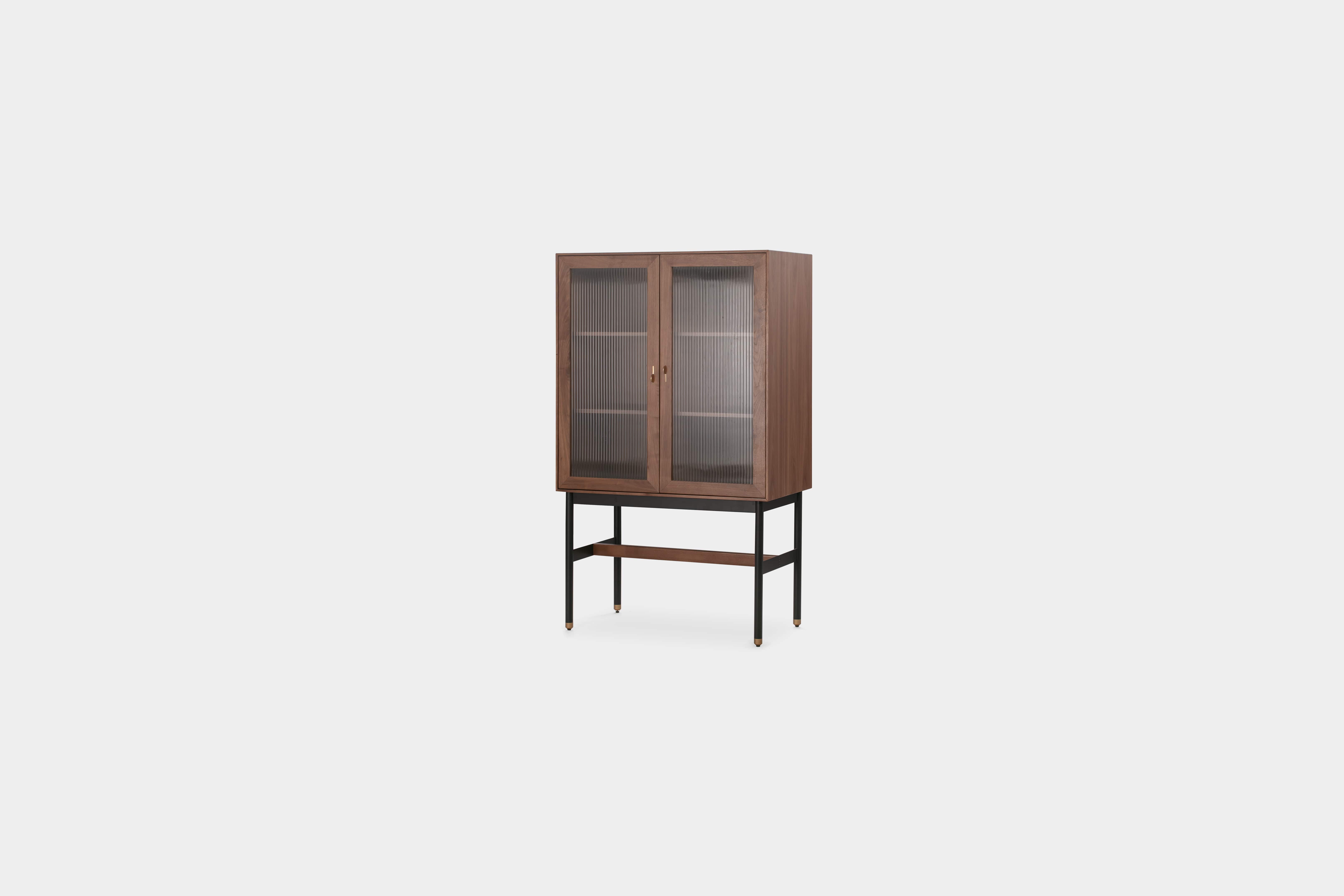 The Cabo glass cabinet in a full glass door configuration. Brass hardware and adjustable shelves. Matt black or brushed steel metal base. Design by Anders Ostberg.