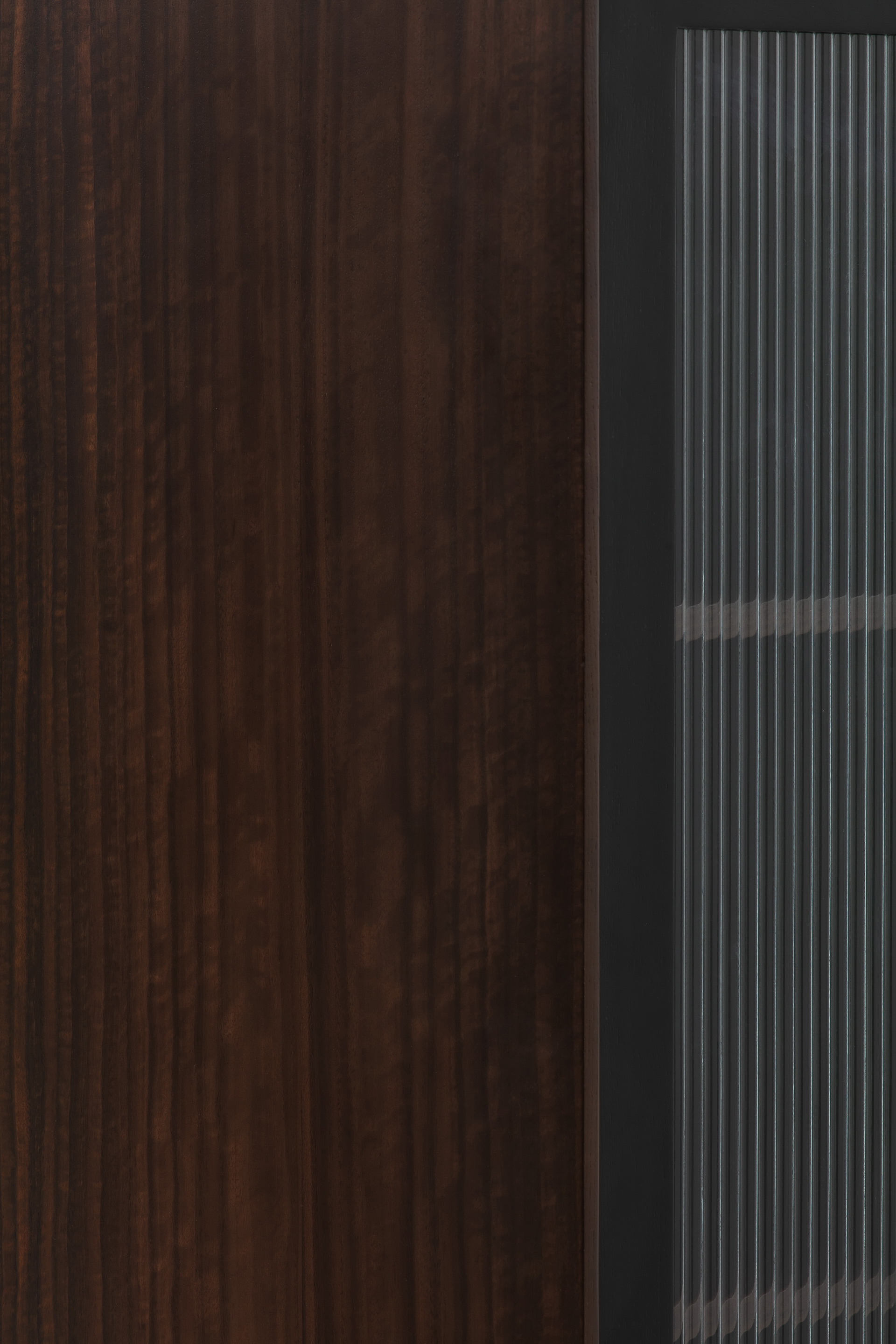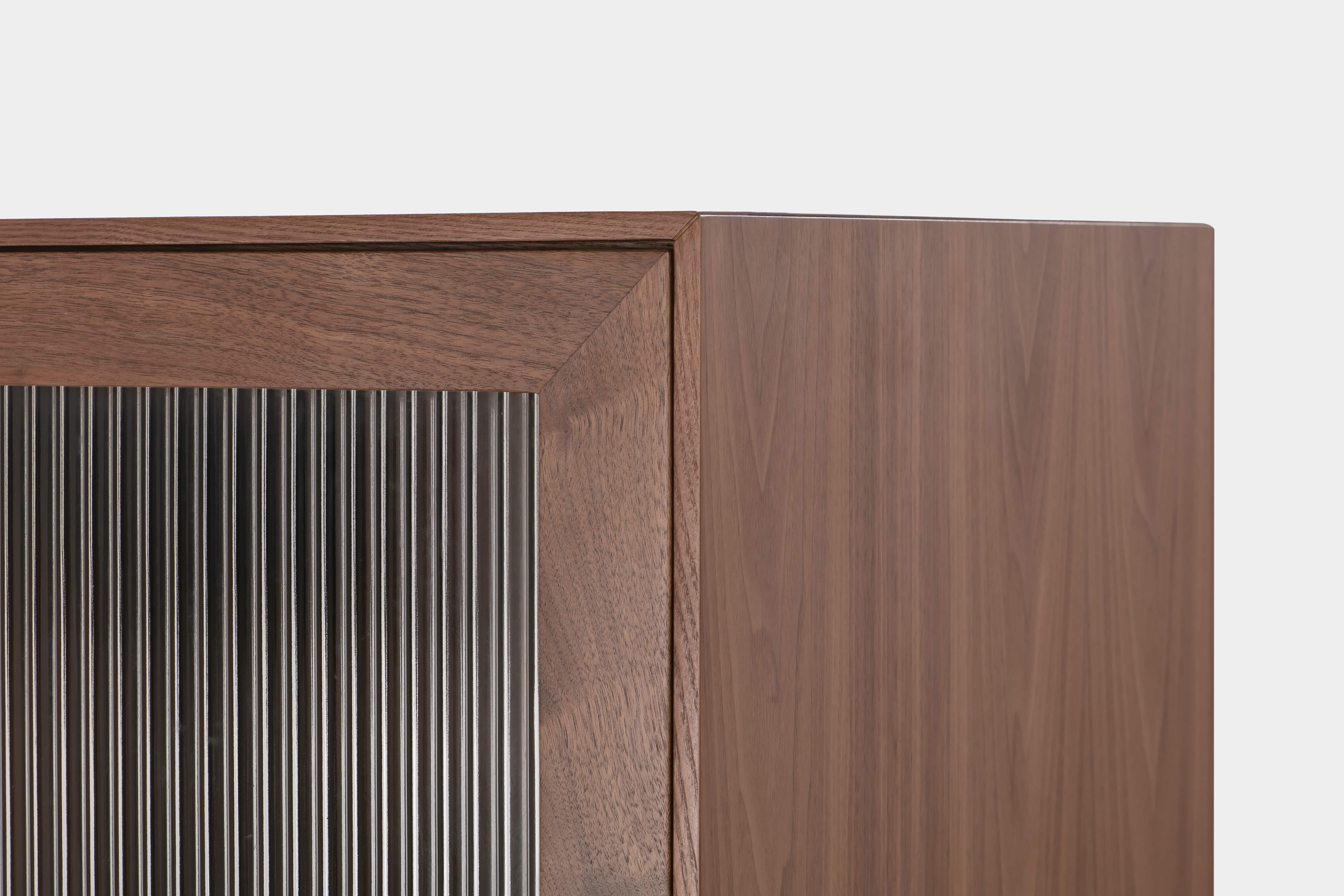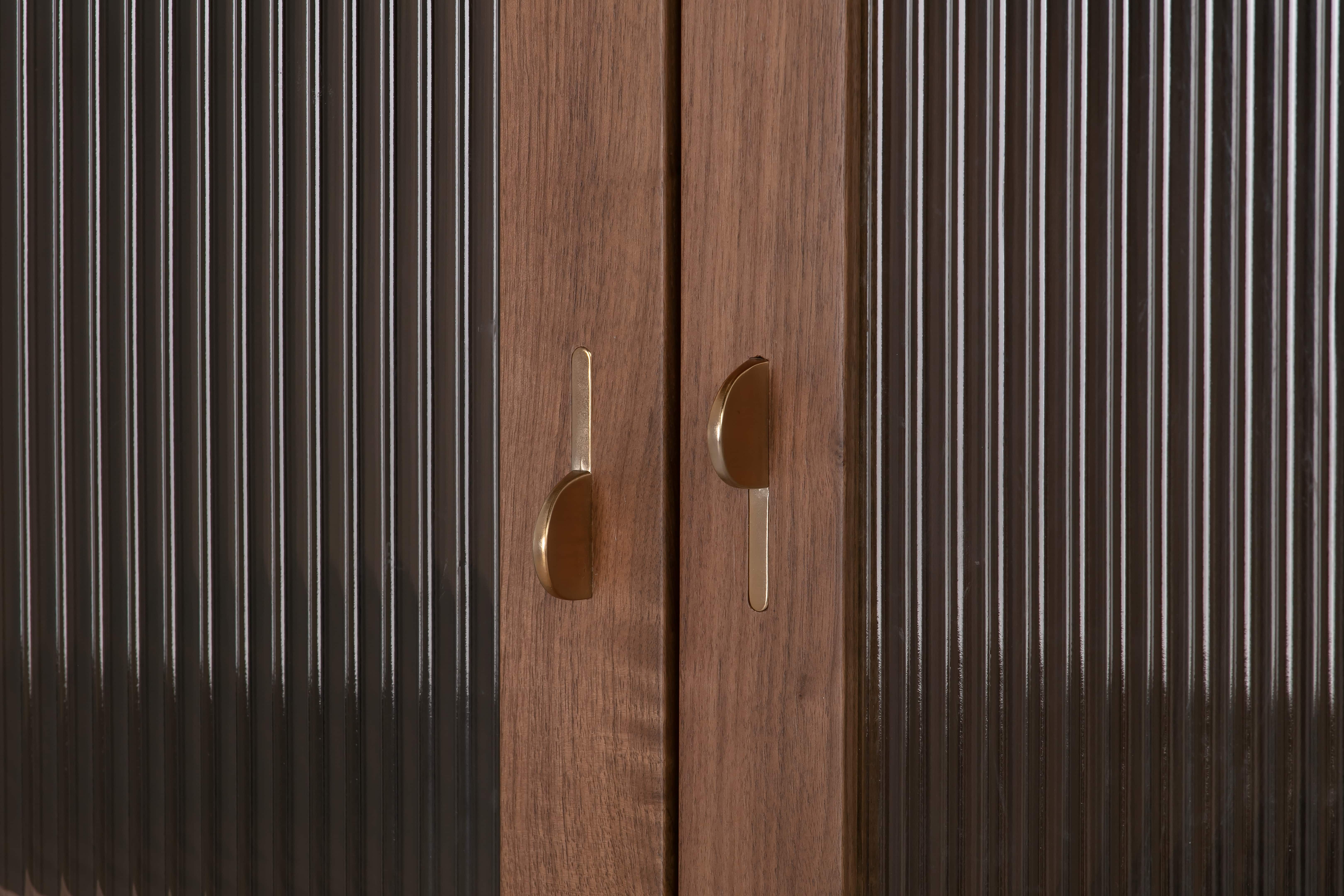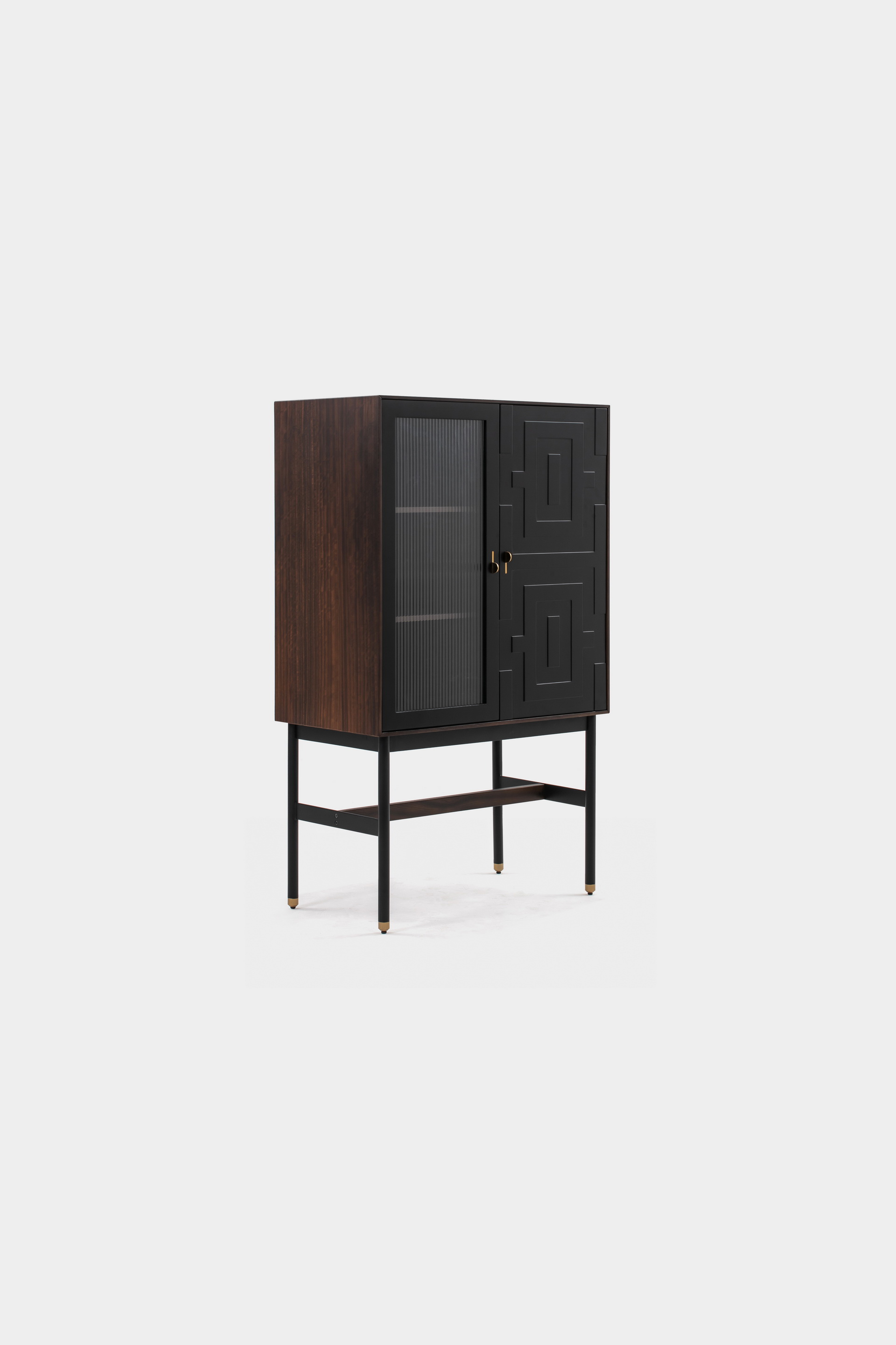 The Cabo glass cabinet in a full glass door configuration. Brass hardware and adjustable shelves. Matt black or brushed steel metal base. Design by Anders Ostberg.