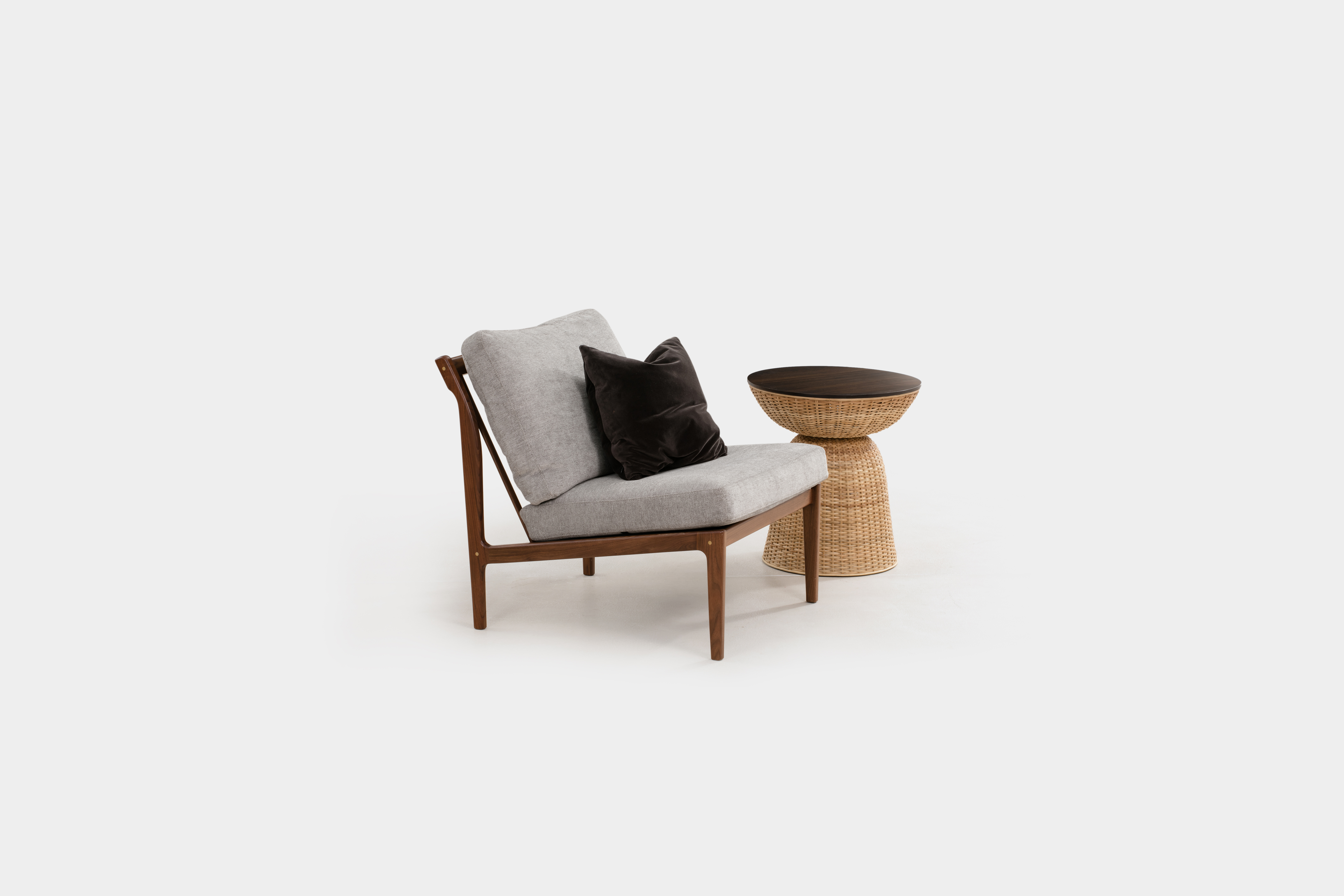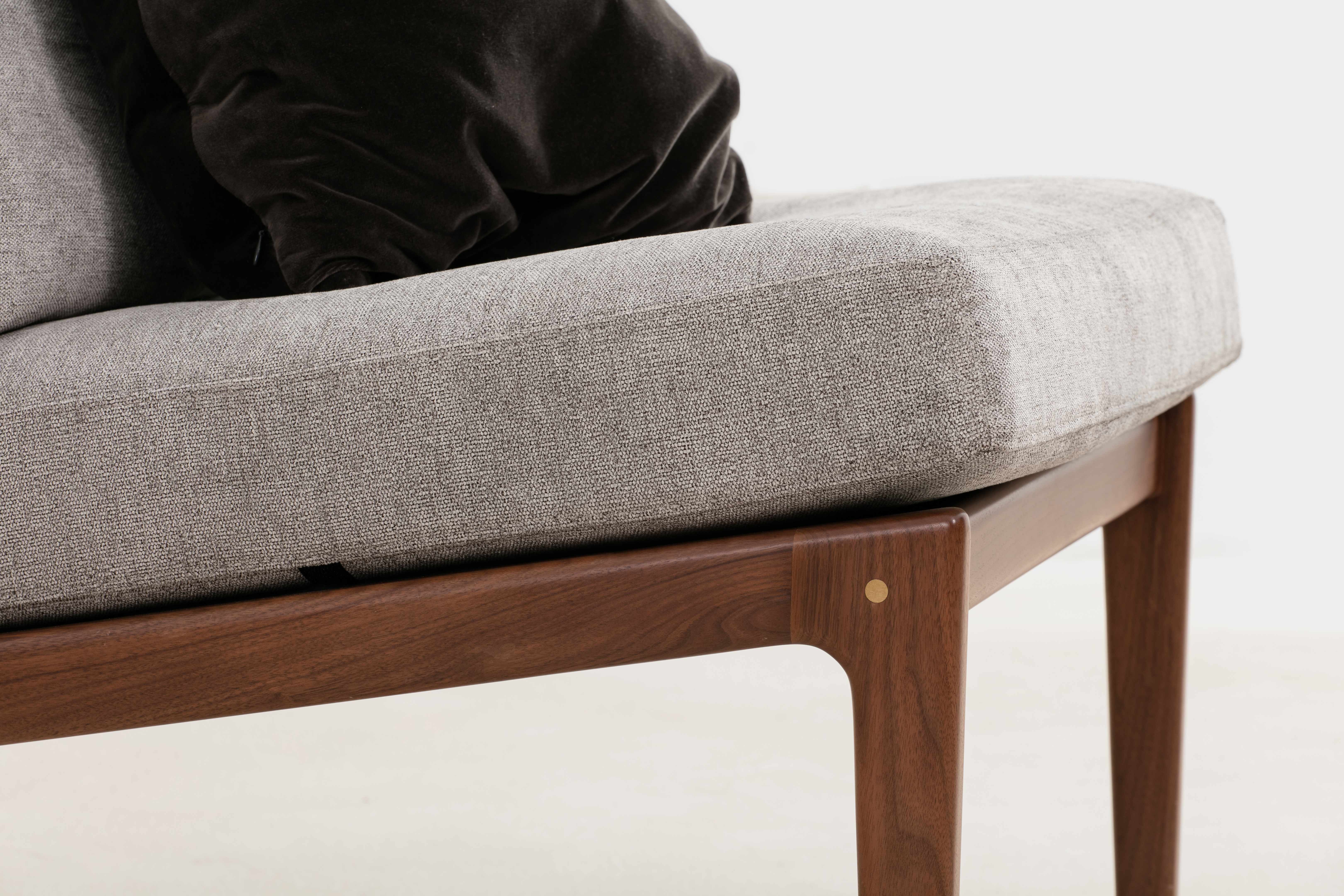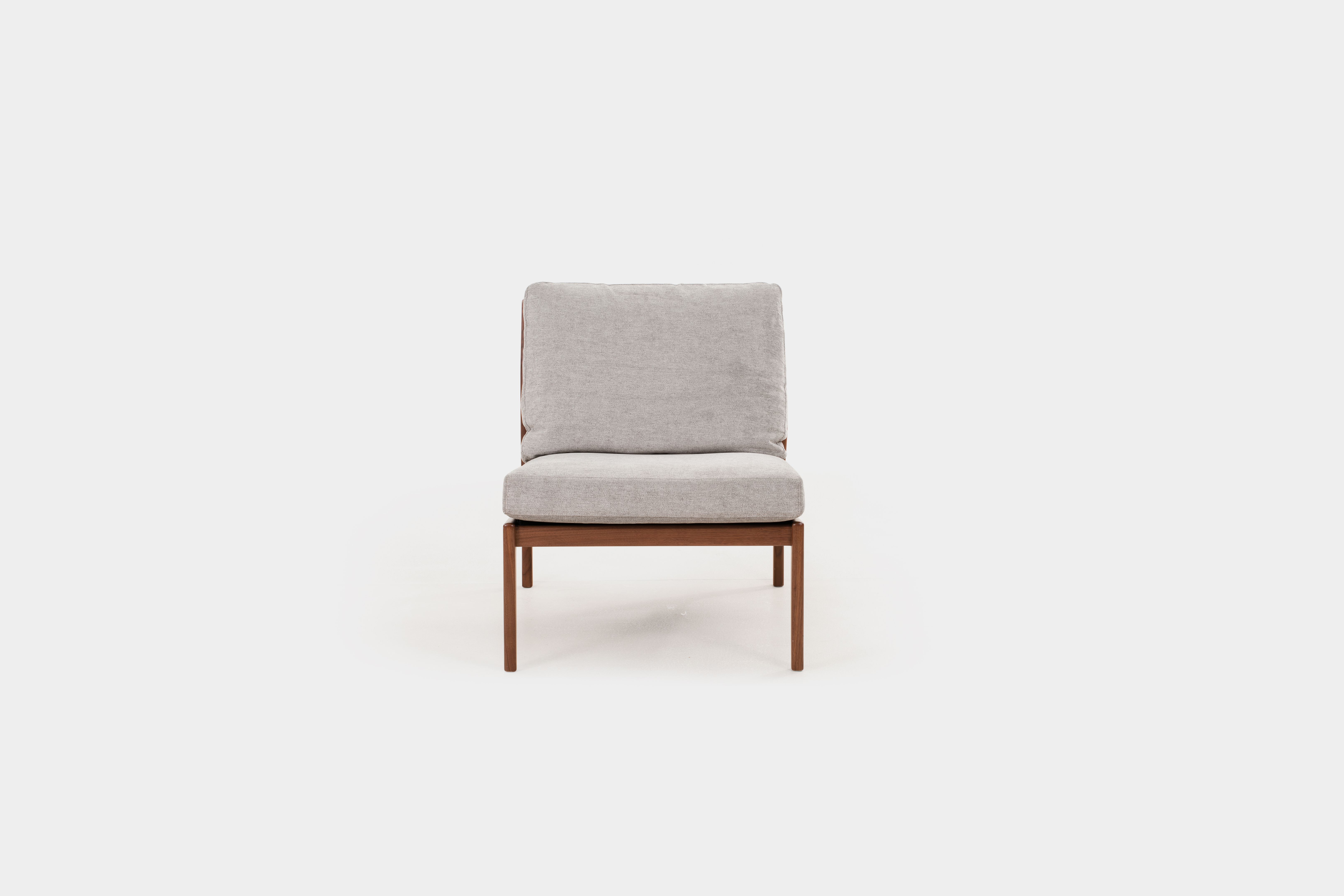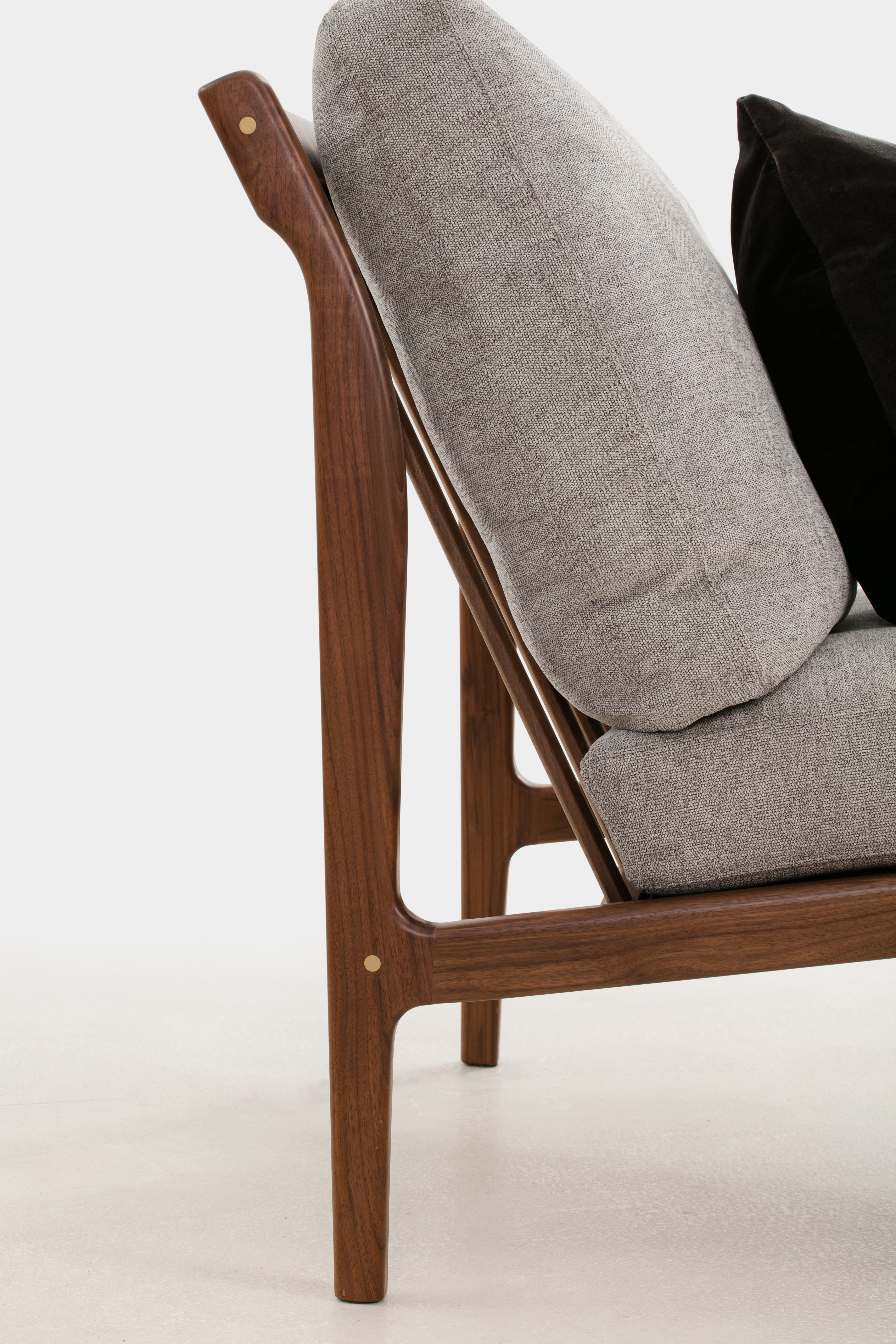 The Cabo lounge chair in a sleak and open configuration. Solid timber frame with a brass pin detail. Available with leather or fabric upholstery. Design by Anders Ostberg.