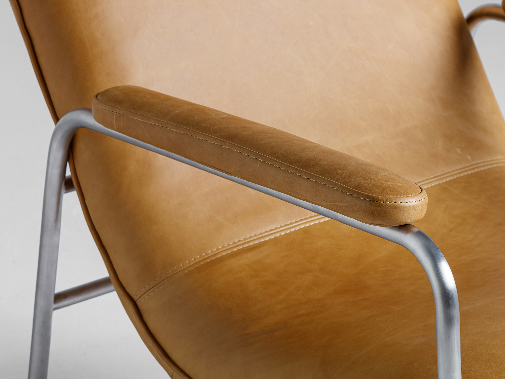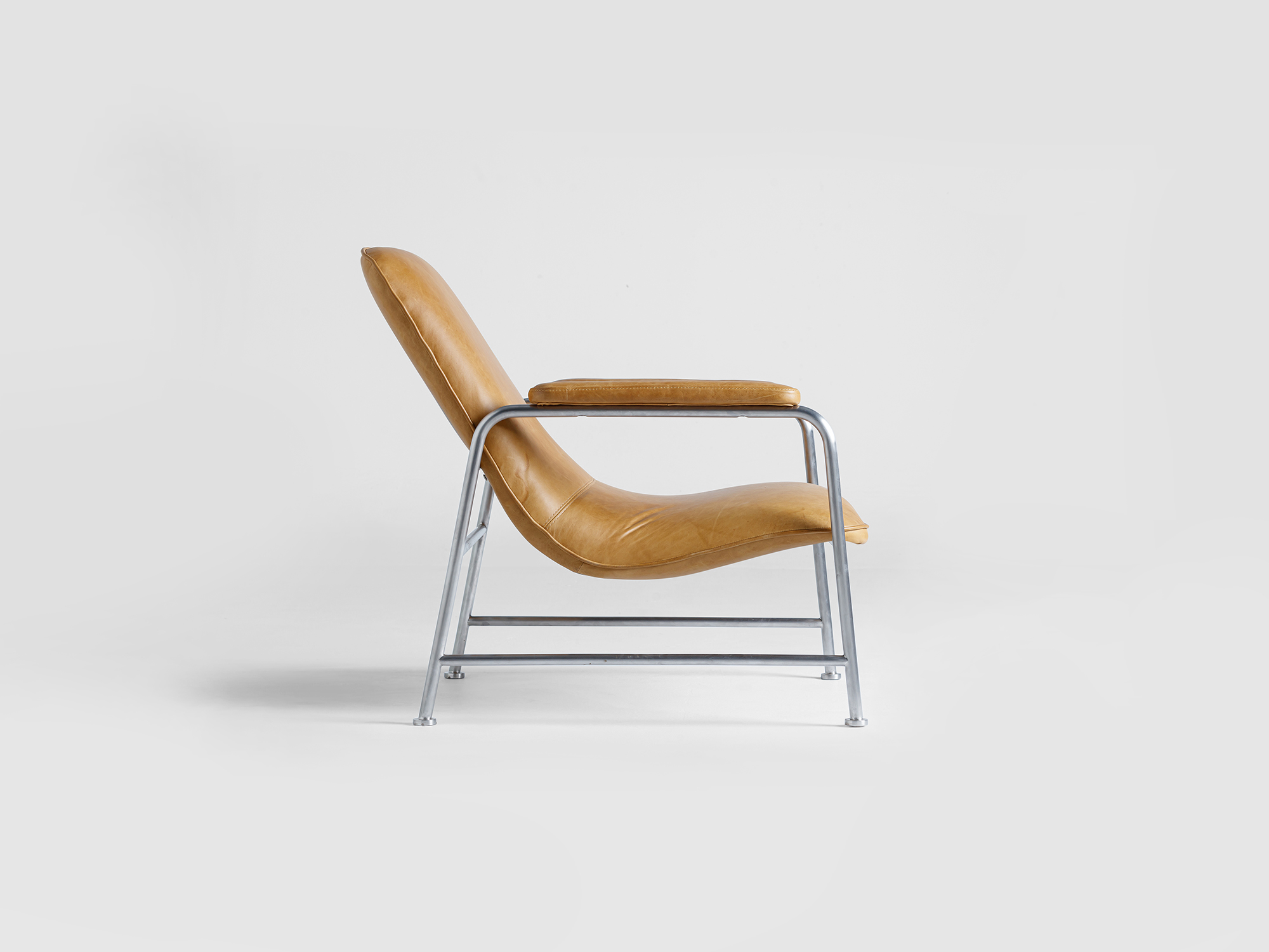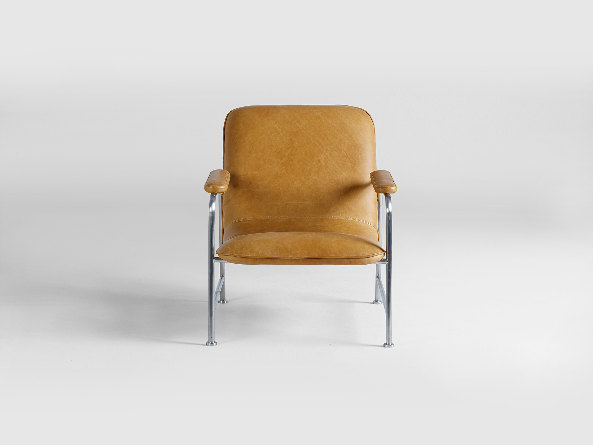 The Shibuya lounge chair available in stainless or powder coated steel frame with leather or fabric upholstery.