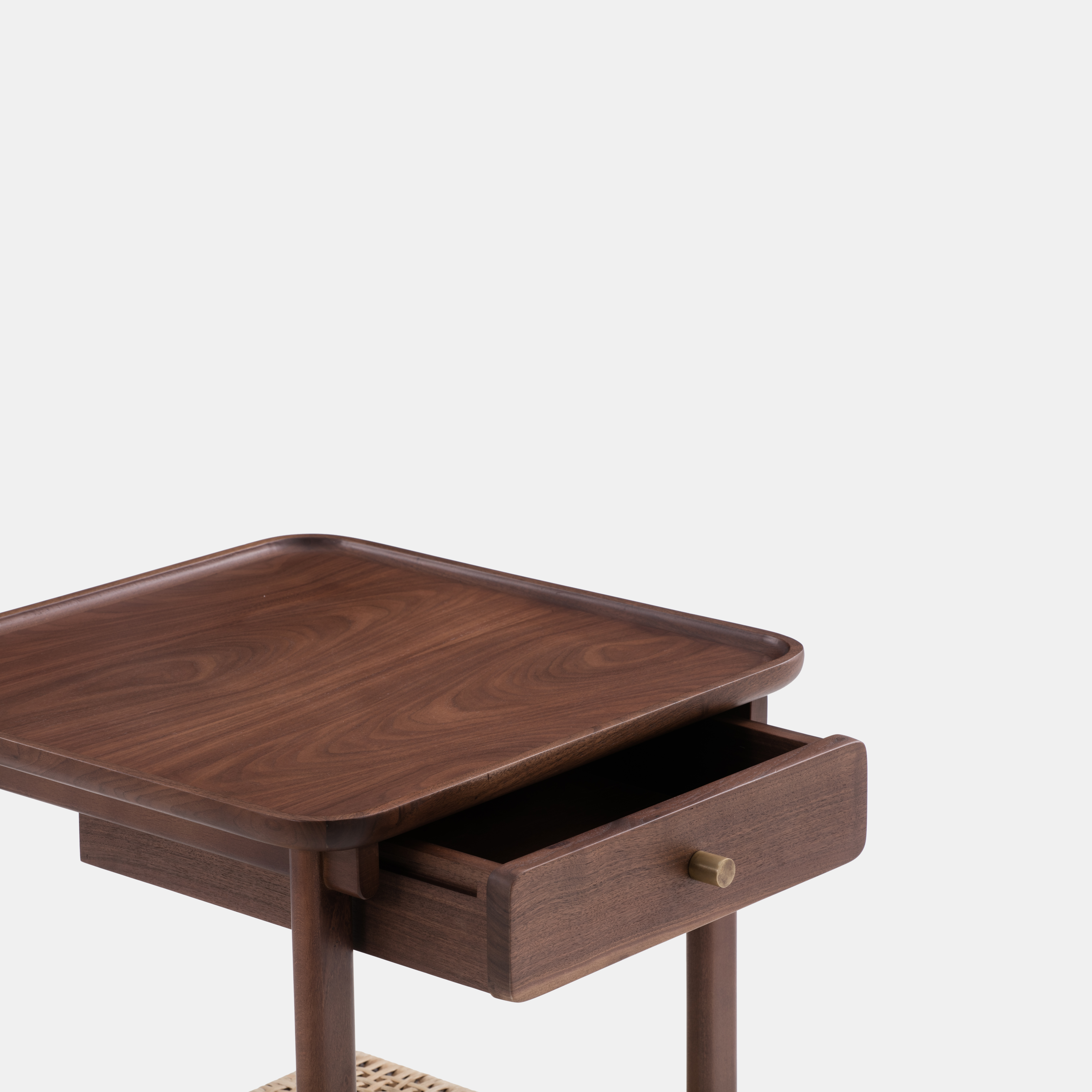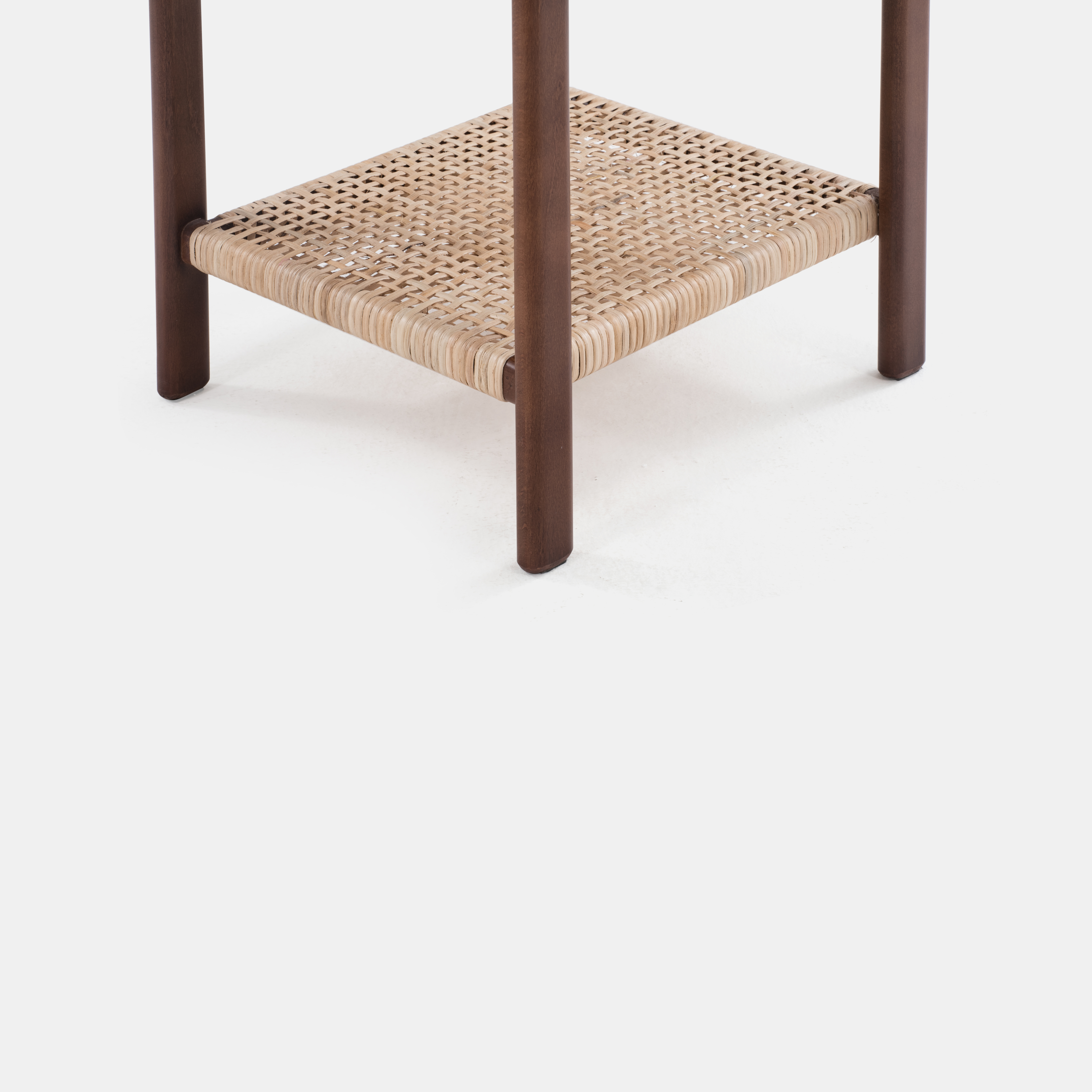 Saigon bedside table with natural rattan shelf and brass hardware. Design by Mathieu Gustavsson.