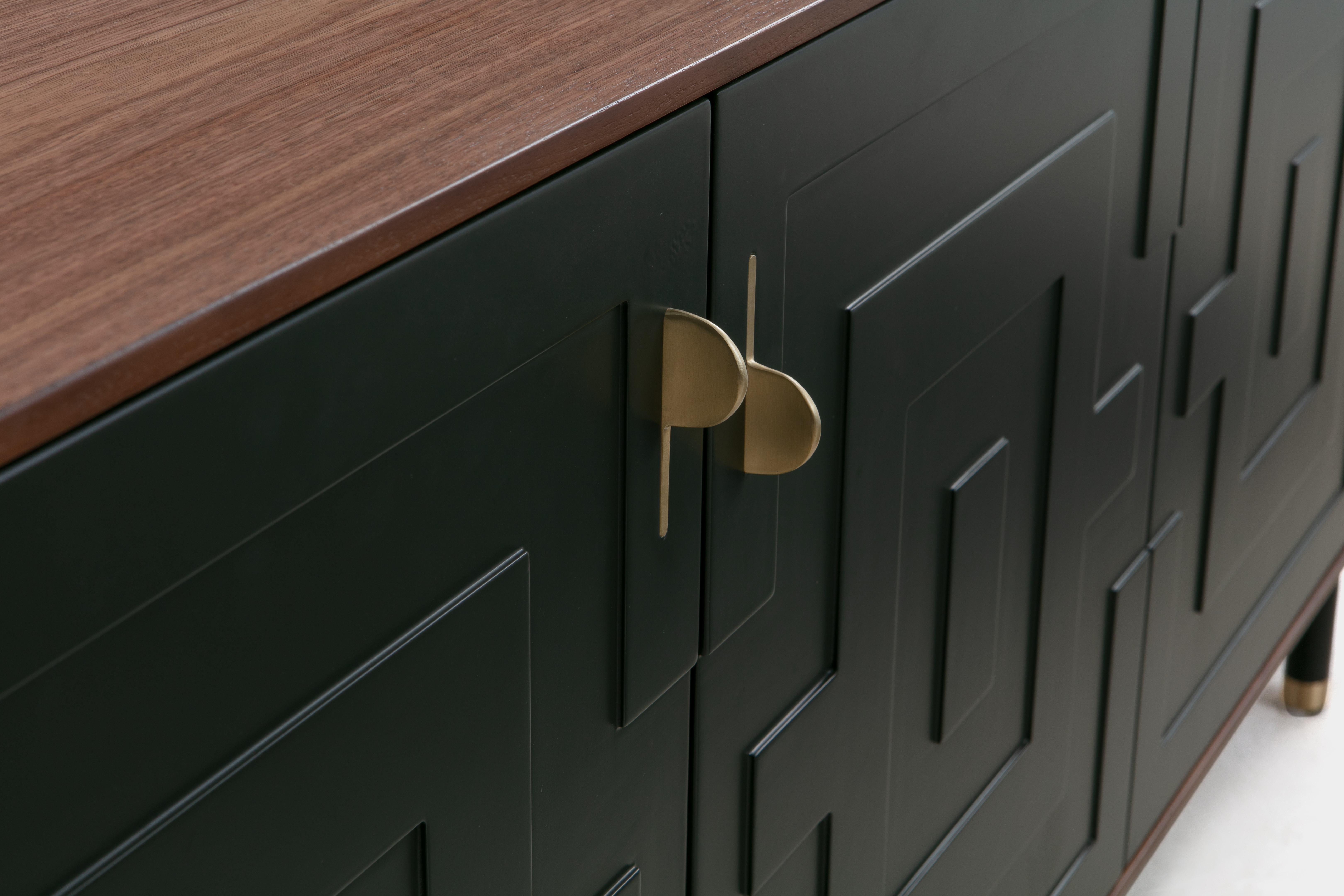 The Cabo sideboard with the iconic patterned door fronts. Brass painted hardware and metal feet. Design by Anders Ostberg.