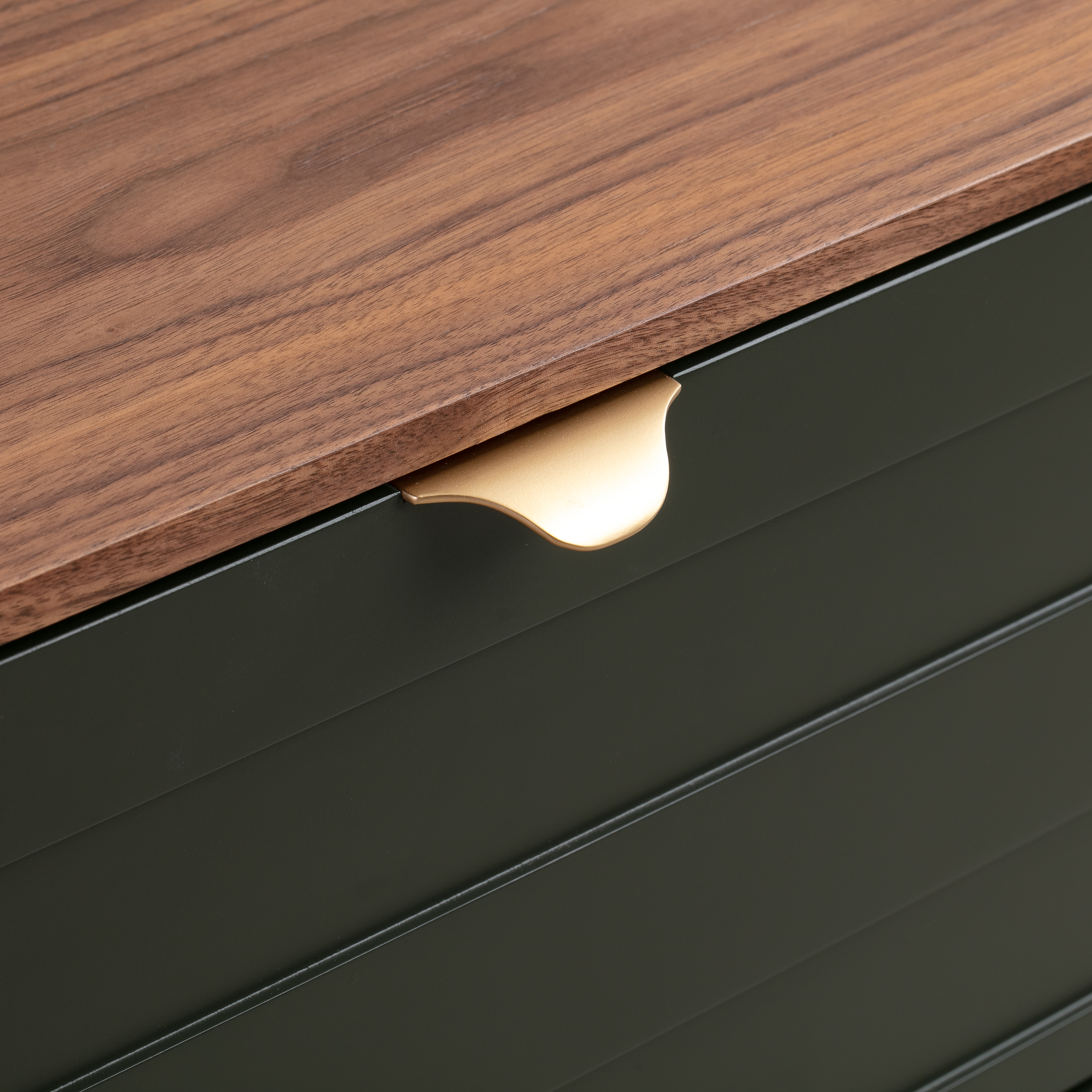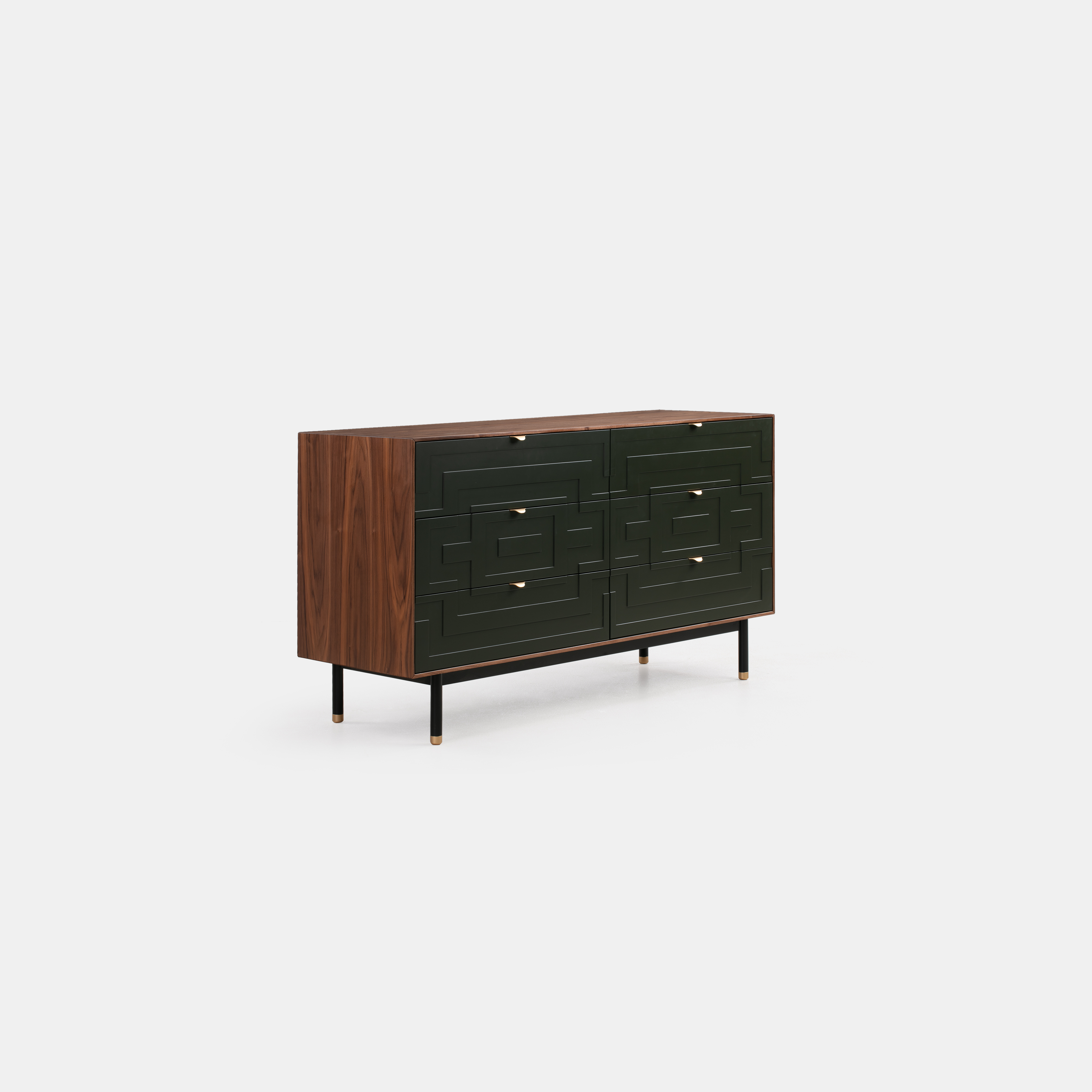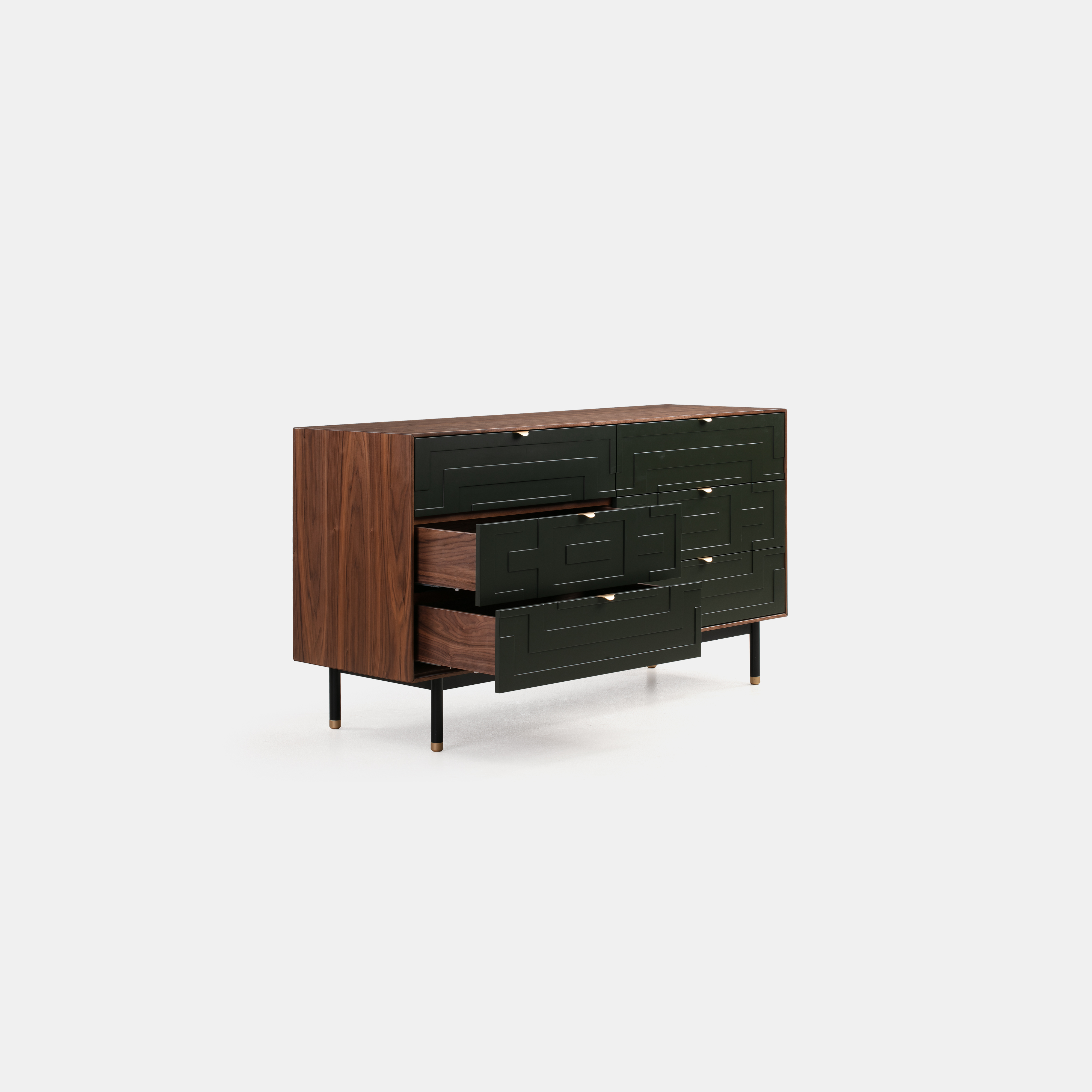 The Cabo dresser with 6 drawers and patterned drawer fronts. Metal legs with brass detail. Design by Anders Ostberg.