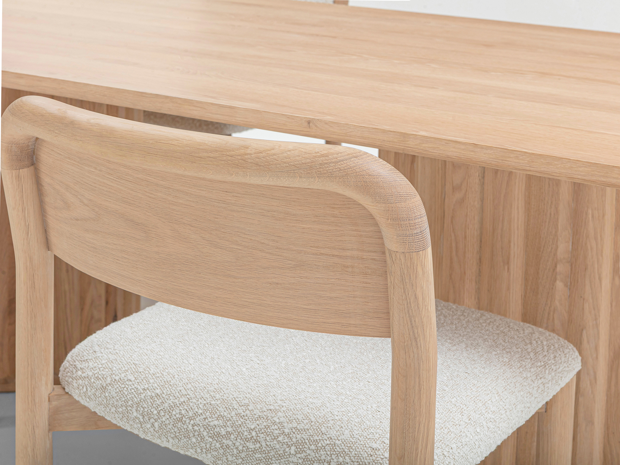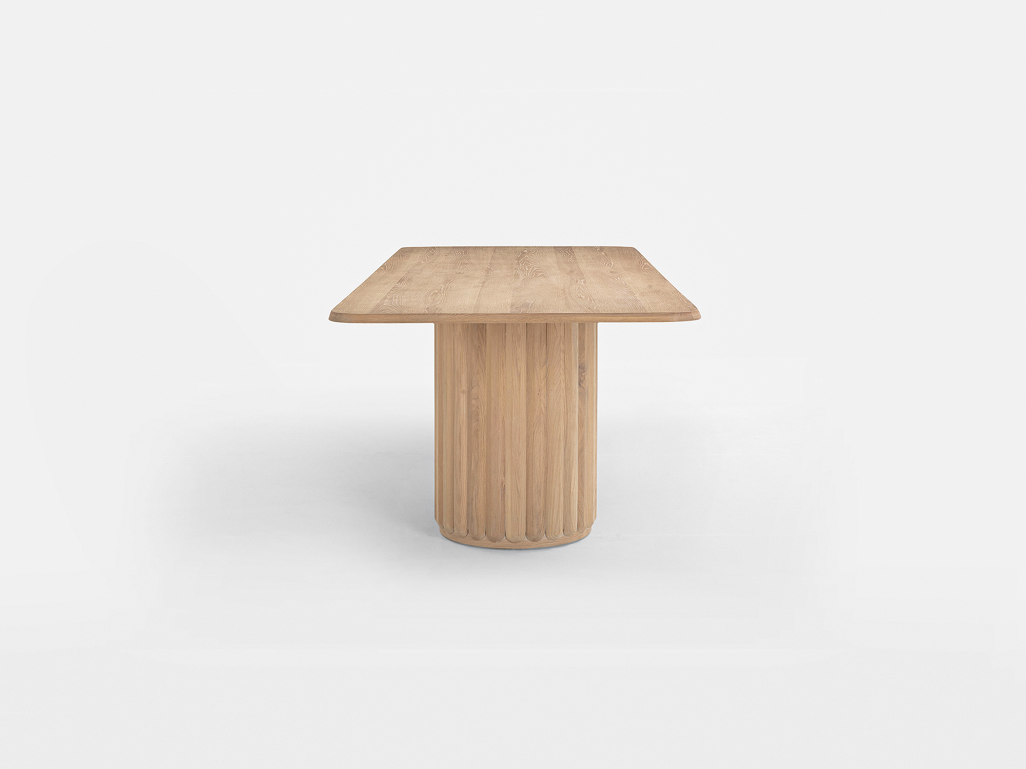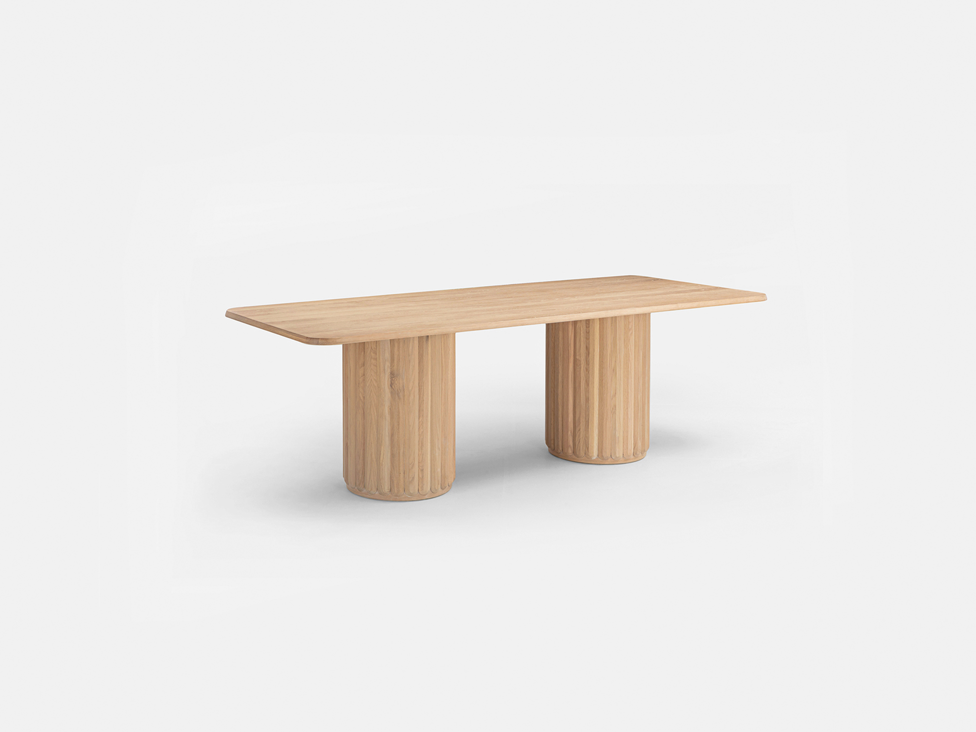 The Solana dining table features a sturdy scalloped column timber base and a chamfered table top in a light natural Oak with a Tung oil finish. Design by: James Patterson